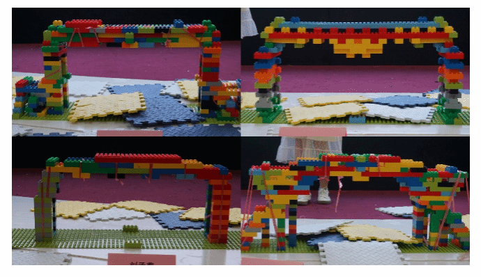 以我国交通基础设施建设的高速发展为背景,利用一定数量的积木,设计符合赛制尺寸要求的轻质高强度大跨度承载结构,充分发挥同学们力学知识与审美相结合的能力,达到力与美的高度融合,实现理论与实践的有机结合。模型立面图如图一所示,实际模型如图二所示(不局限于图二外观)。