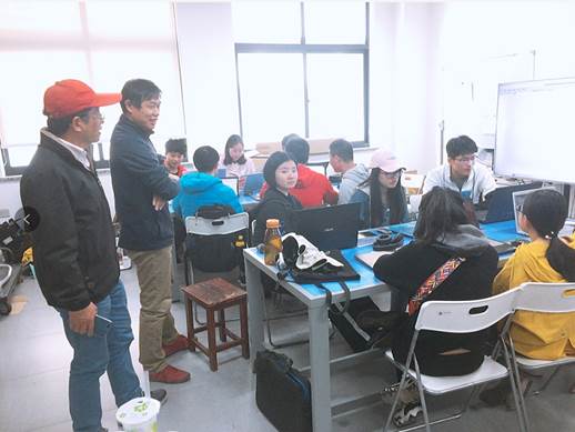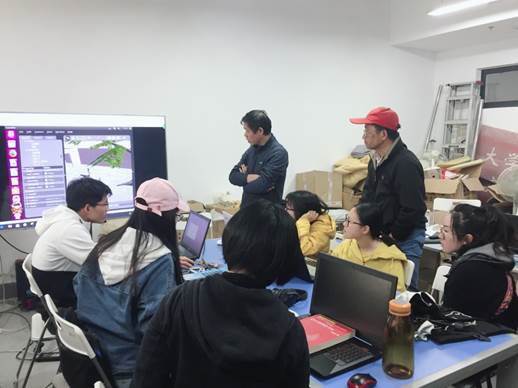 图三、陈万米老师和黄慎之老师对3D仿真成果进行评定打分