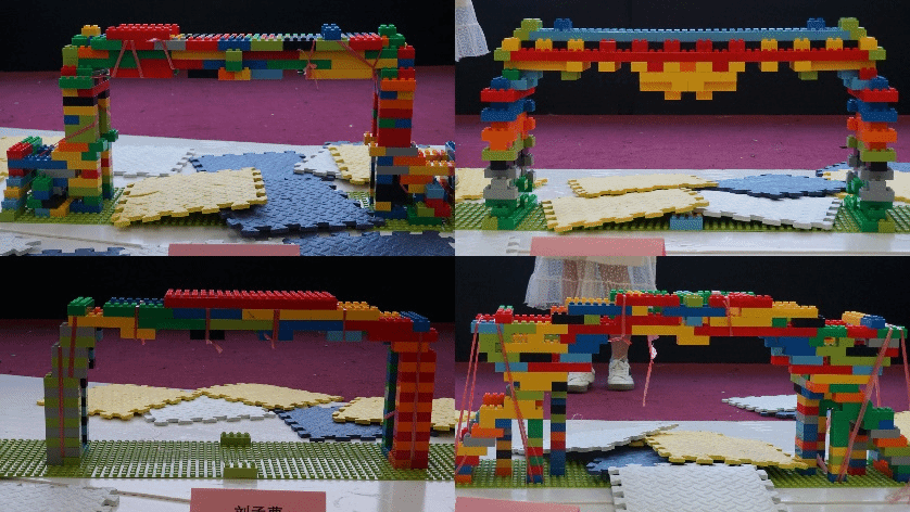 以我国交通基础设施建设的高速发展为背景,利用一定数量的积木,设计符合赛制尺寸要求的轻质高强度大跨度承载结构,充分发挥同学们力学知识与审美相结合的能力,实现理论与实践的有机结合。模型立面图如图一所示,实际模型如图二所示(不局限于图二外观)。
