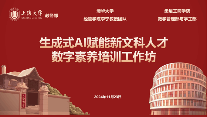 2024年11月23日,为帮助学生提升生成式人工智能使用能力与数字素养,上海大学教务部、悉尼工商学院、“云+大文科”市级实验教学示范中心联合组织并特邀清华大学经管学院李宁教授团队开展“生成式AI赋能新文科人才数字素养培训工作坊”。