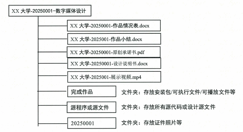 作品所有的文件保存在以“学校-参赛编号-作品类别”命名的文件夹中, 并上传至百度云, 链接地址和密码填写在作品清单中。例如,假定有一 XX 大学编号为20250001 的数字媒体设计作品, 则目录结构及提交的文件应为: