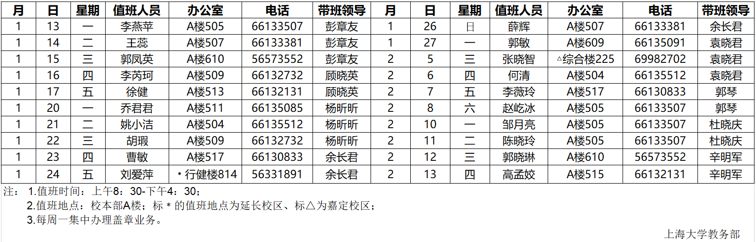 教务部2024-2025学年寒假值班表