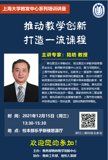 教务部教师教学发展中心拟举办“推动教学创新,打造一流课程”专题培训,时间定于12月15日(周三)13:30——15:30,地点为乐乎新楼思源厅,欢迎老师们参加!老师们可扫描图片中的二维码报名。
