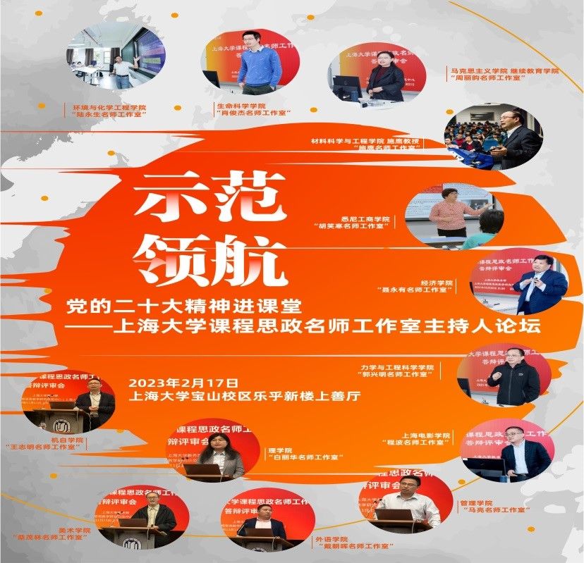 如何将党的二十大精神有机融入课堂教学?如何结合教师学术研究在各类课程教学中讲好讲活讲深党的创新理论,全面提高人才培养质量?如何建设高素质教师队伍,推进课程思政名师工作室发展建设开启新征程,迈上新台阶?2023年2月17日,教育部课程思政教学研究示范中心(上海大学)举办“示范领航 讲好大思政课:上海大学课程思政名师工作室主持人论坛”,总结推广融入党的二十大精神讲好大思政课的可借鉴性经验与思考。