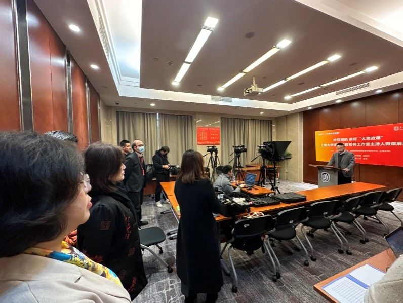 会议一,举办“党的二十大进课堂”——课程思政名师工作室主持人微课展示。一整天,每人2段视频(教学思考分享与融入的知识点讲授),12位老师作好充分准备,从不同校区汇聚校本部乐乎新楼,面对摄像机侃侃而谈,展示名师对党的最新理论的学习领悟与教学设计思考。上海大学党委常委、副校长聂清拨冗前来探班,给老师们打气。