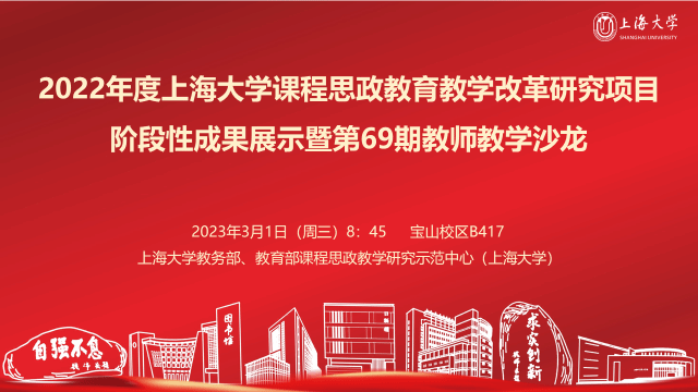 2023年3月1日上午,上海大学教务部、教育部课程思政教学研究示范中心(上海大学)在宝山校区B417智慧教室举办第69期教师教学沙龙,22所学院的30位项目负责人展示2022年度上海大学课程思政教育教学改革研究项目阶段性成果。上海大学教务部副部长、教育部课程思政教学研究示范中心(上海大学)负责人顾晓英担任主持。上海大学党委常委、副校长聂清出席沙龙并讲话。