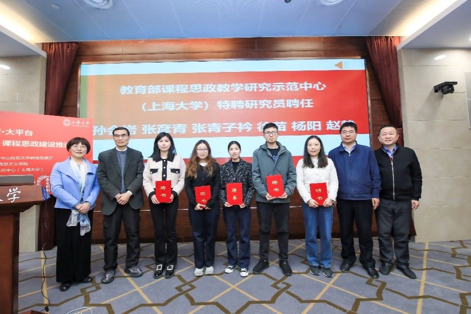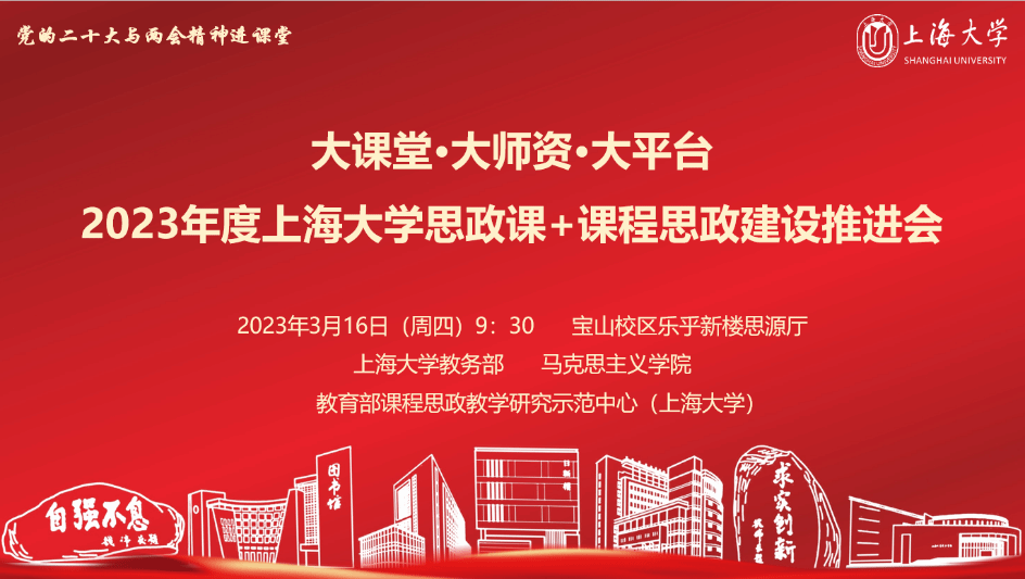 “积蓄力量,攀登大平台。”会上展示“2022年上海高校思想政治理论课质量提升行动”获奖名单,祝贺在上海高校思政课教师研修基地、思政课名师工作室和思政课教学大比武中获奖的组织和教师;播放了国家级课程思政教学名师、上海市课程思政教学名师和上海大学课程思政名师工作室主持人的“名师说”;举行上海大学新一批课程思政名师工作室授牌仪式和教育部课程思政教学研究示范中心(上海大学)特聘研究员聘任仪式;首次发布“党的二十大精神进课堂”微课花絮,从线下到云端,上海大学课程思政在网络“大平台”中继续绽放理论光芒和感召力量。
