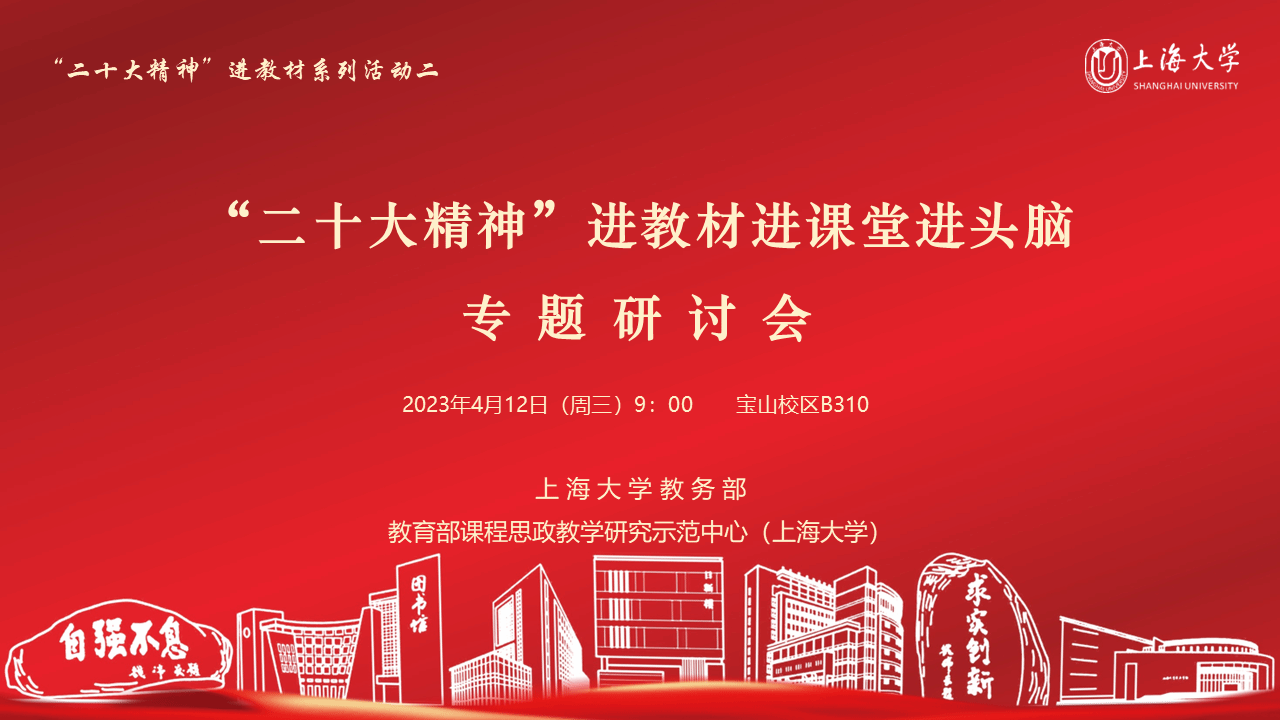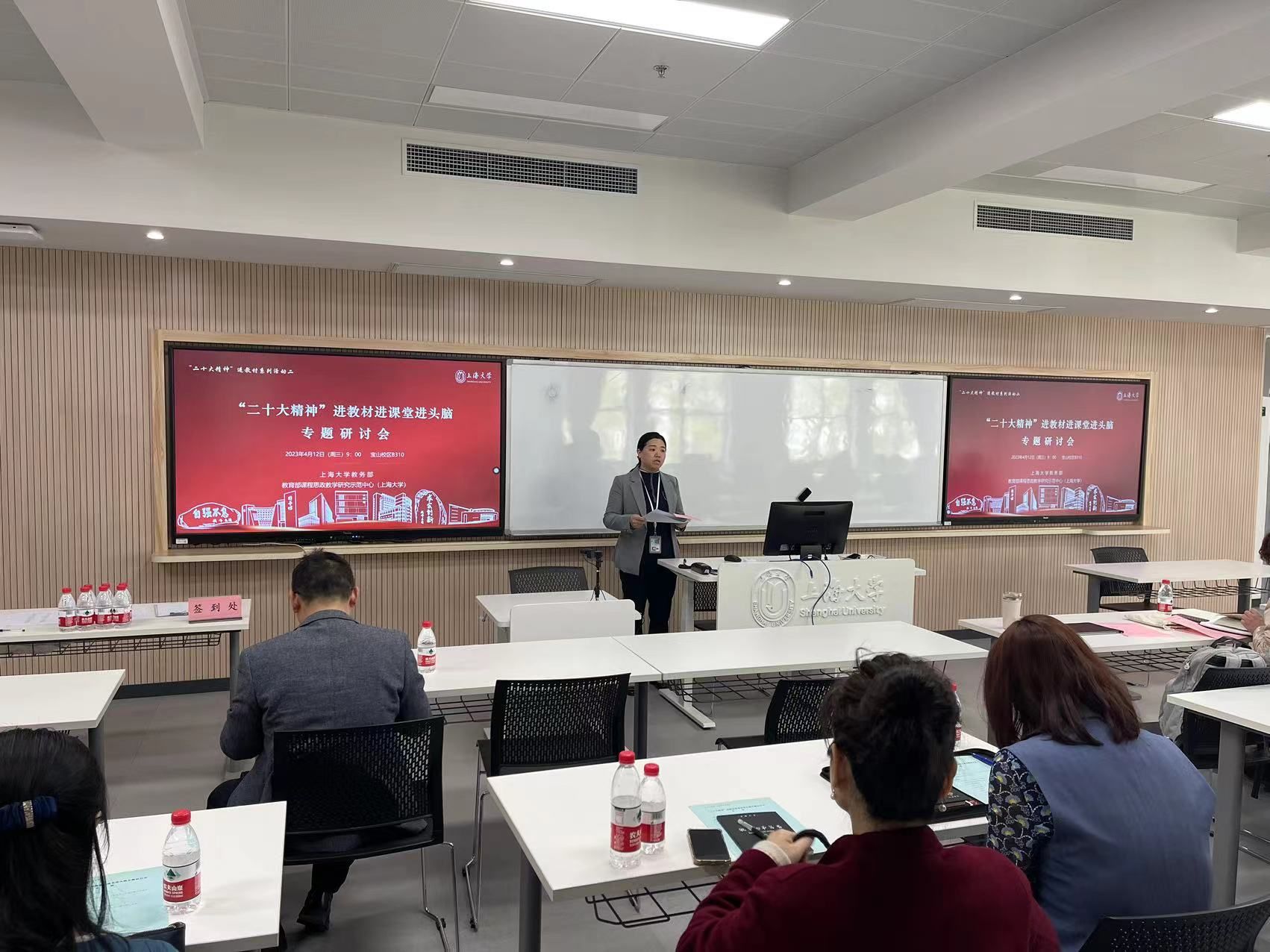 4月12日上午9点,教务部于宝山校区B310教室举办 “二十大精神”进教材进课堂进头脑专题研讨会,邀请到马克思主义学院、上海美术学院、社会学院、法学院、文学院、管理学院和机电工程与自动化学院的7位教师代表进行专题分享。各专业负责人和骨干教师代表共五十余人参加本次研讨会。本场研讨会由教务部教学建设处处长杨昕昕主持,教务部副部长、教育部课程思政教学研究示范中心(上海大学)主任顾晓英出席本场研讨会,建设处皮文彬、邹月亮、赵屹冰和课程思政教学研究中心曹园园等参会。