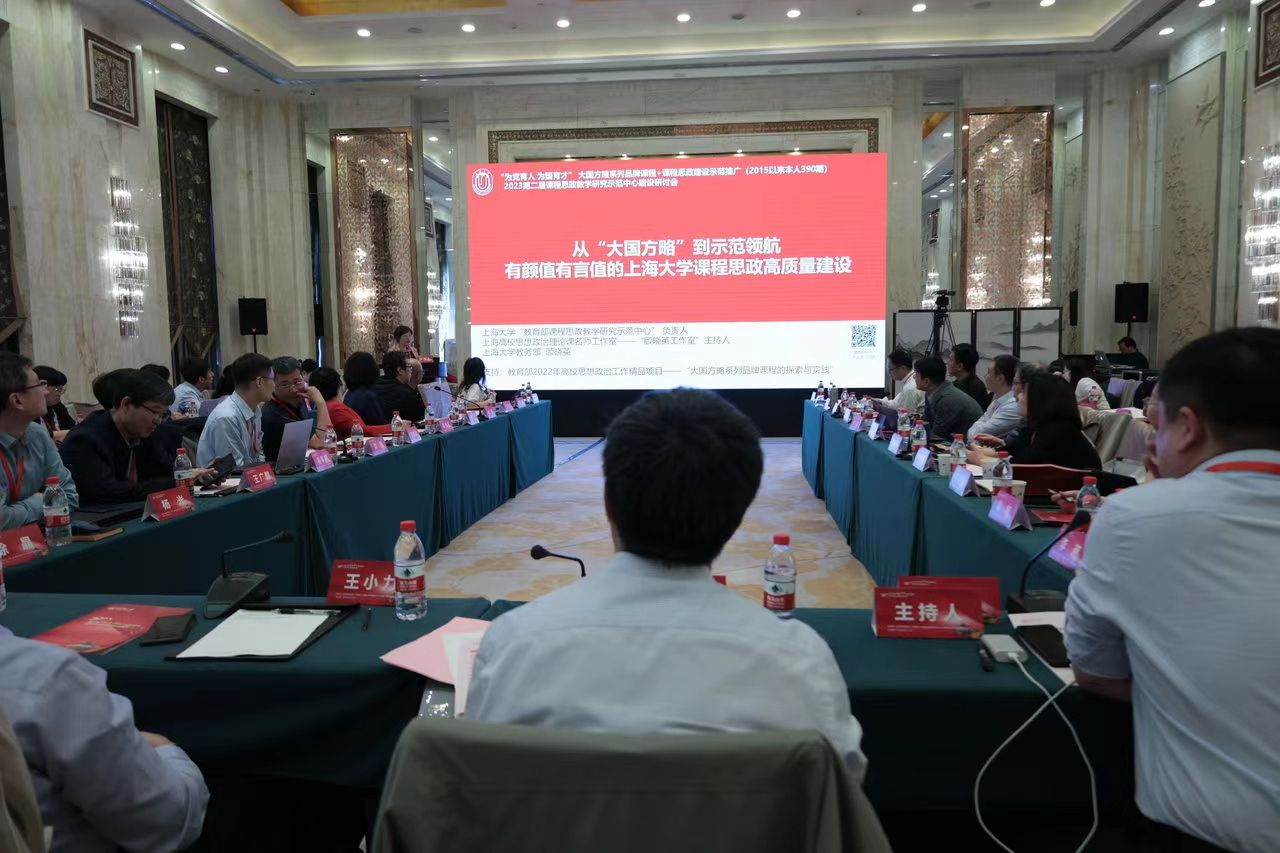 上海大学进一步学习贯彻党的二十大精神,立足校本特色,主动作为,充分发挥教育部课程思政示范项目作用,经常性举办课程思政名师金课教育教学沙龙、教学研讨会、培训班、工作坊等,提升教师课程思政建设意识和能力;由“点”到“线”到“面”都大中小学一体化、继教-本研联通,组织教师深入开展课程思政理论研究和教学实践,探索创新课程思政建设的方法路径,出版《课程思政教学设计》《媒体中的我们:聚焦上海大学课程思政》等教研著作;成立全国高校党史类课程联盟,让“红色项链”党史学习教育点亮更多高校线上线下课堂。