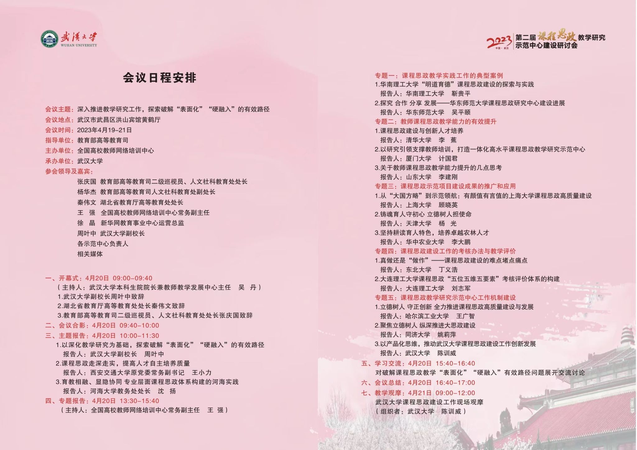 2023年4月20日,第二届全国课程思政教学研究示范中心建设研讨会在武汉大学举行。研讨会由教育部高等教育司指导,全国高校教师网络培训中心主办、武汉大学承办。教育部高等教育司二级巡视员、人文社科教育处处长张庆国,副处长杨华杰,湖北省教育厅高等教育处处长秦伟文,武汉大学副校长周叶中,全国高校教师网络培训中心常务副主任王强,新华网教育事业中心运营总监徐晶,15家首批普通高等教育国家级课程思政教学研究示范中心的负责同志、专家等出席会议。