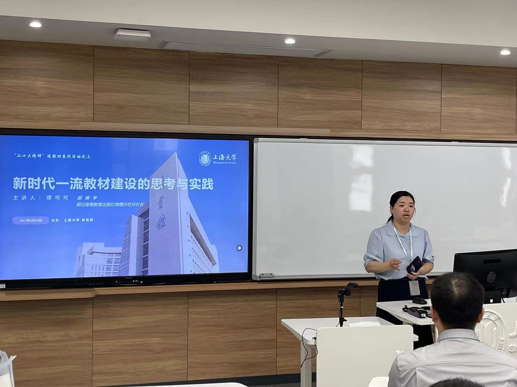 6月30日上午,教务部于宝山校区B416教室举办 “二十大精神“进教材系列活动,邀请到高等教育出版社物理分社社长繆可可副编审,针对于一流教材建设、新形态和数字教材建设做《新时代一流教材建设的思考与实践》专题报告。本场交流会由教务部教学建设处处长杨昕昕主持,建设处邹月亮、赵屹冰等参会。