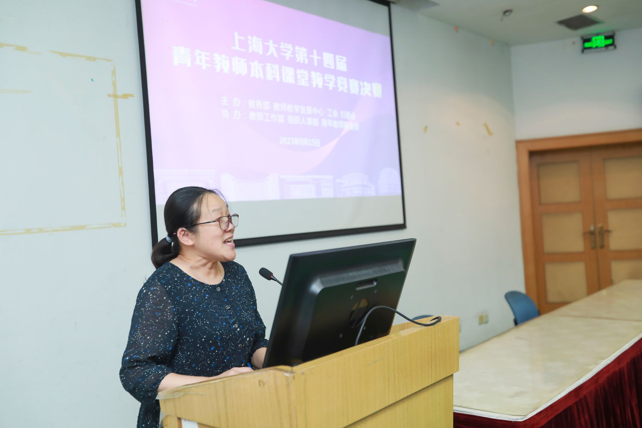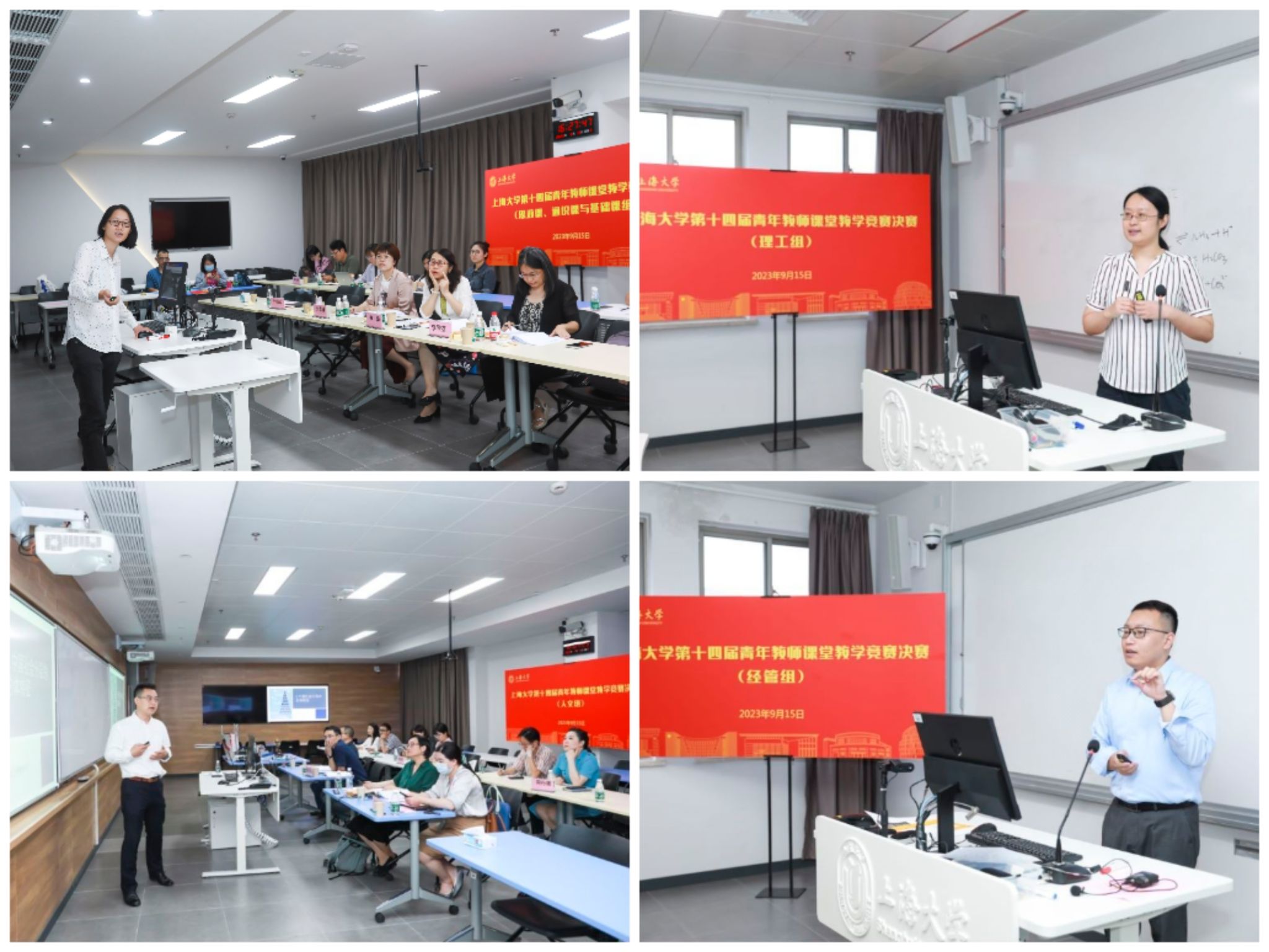 2023年9月15日,上海大学第十四届青年教师本科课堂教学竞赛(以下简称“校青赛”)决赛在宝山校区隆重举行,来26个院系的36位优秀青年教师参加了本次校青赛竞赛决赛。学校党委常委、教师工作部部长曹为民,组织人事部副部长、人事处处长刘丽兰,审计处处长尹应凯,教务部常务副部长彭章友、教务部副部长、教发中心主任辛明军、校工会常务副主席顾莹等行政部处领导、来自复旦大学、上海交通大学等12位校外同行评委以及校内同行专家、青年教师代表等共70余人参加校青赛开幕式和各分赛场的比赛。