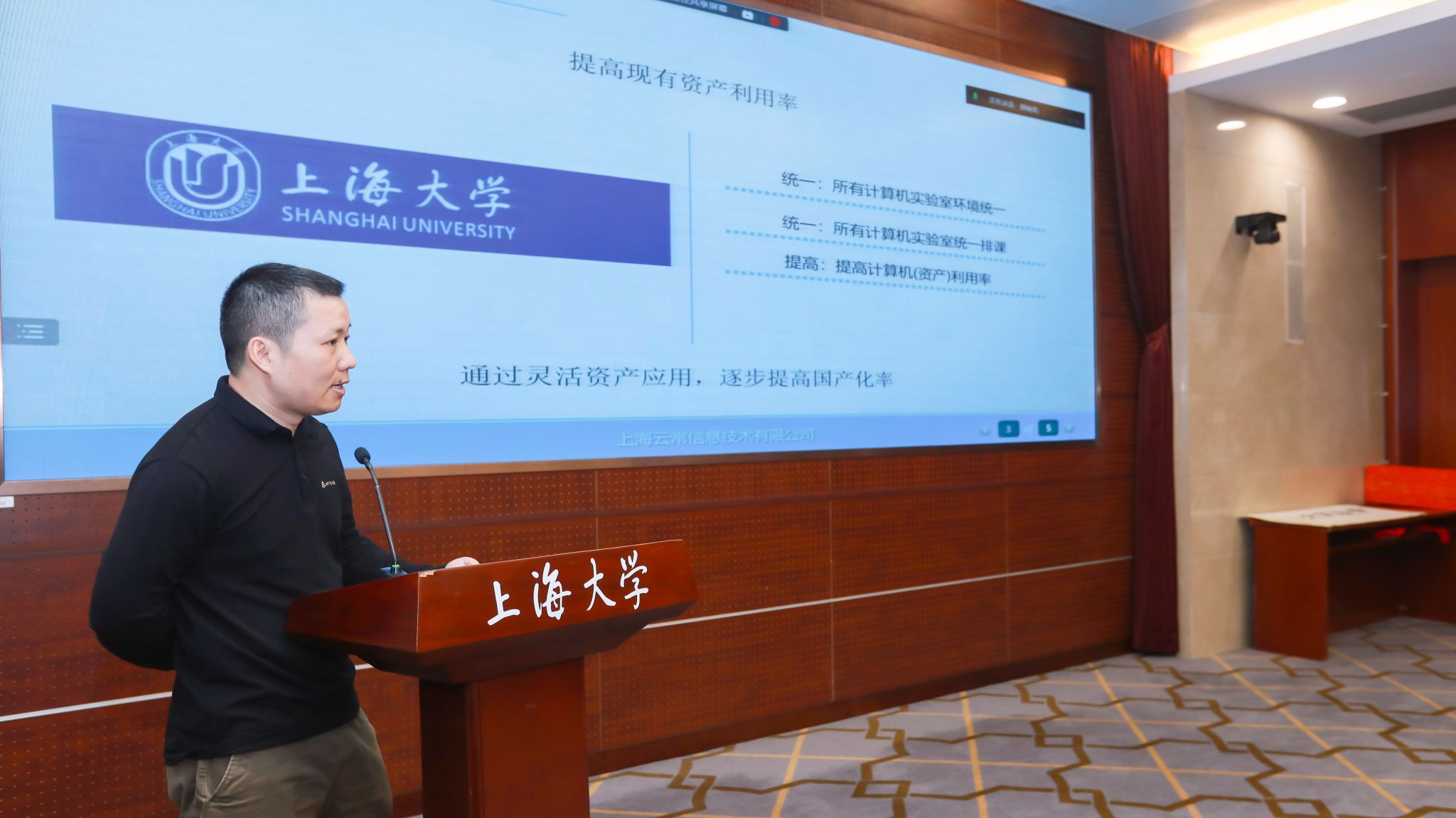 上海云常信息技术有限公司技术总监张帝介绍了“两个统一,一个提高”,期待所有计算机实验室环境统一,所有计算机实验室统一排课,提高计算机(资产)利用率。