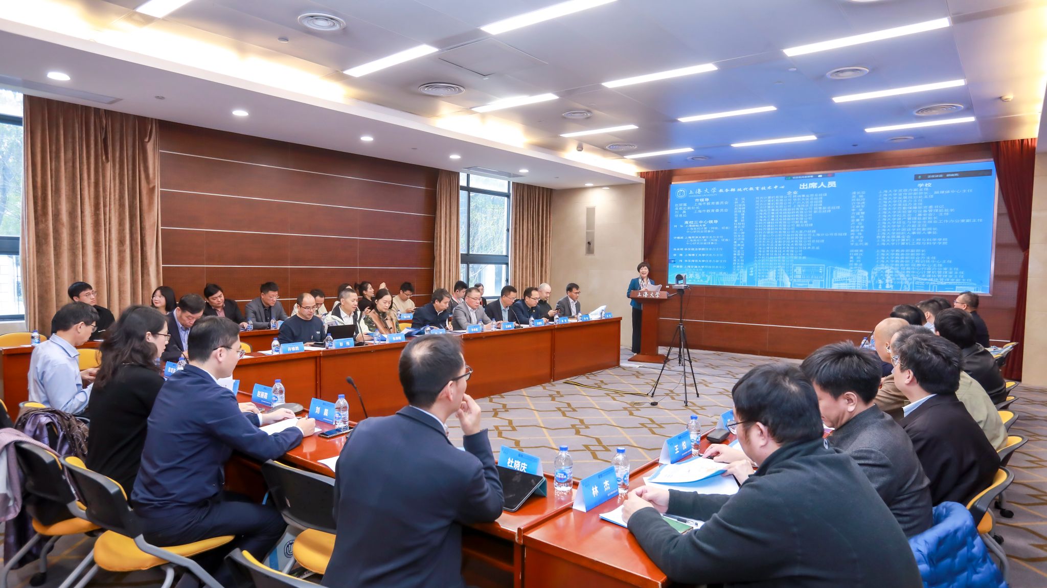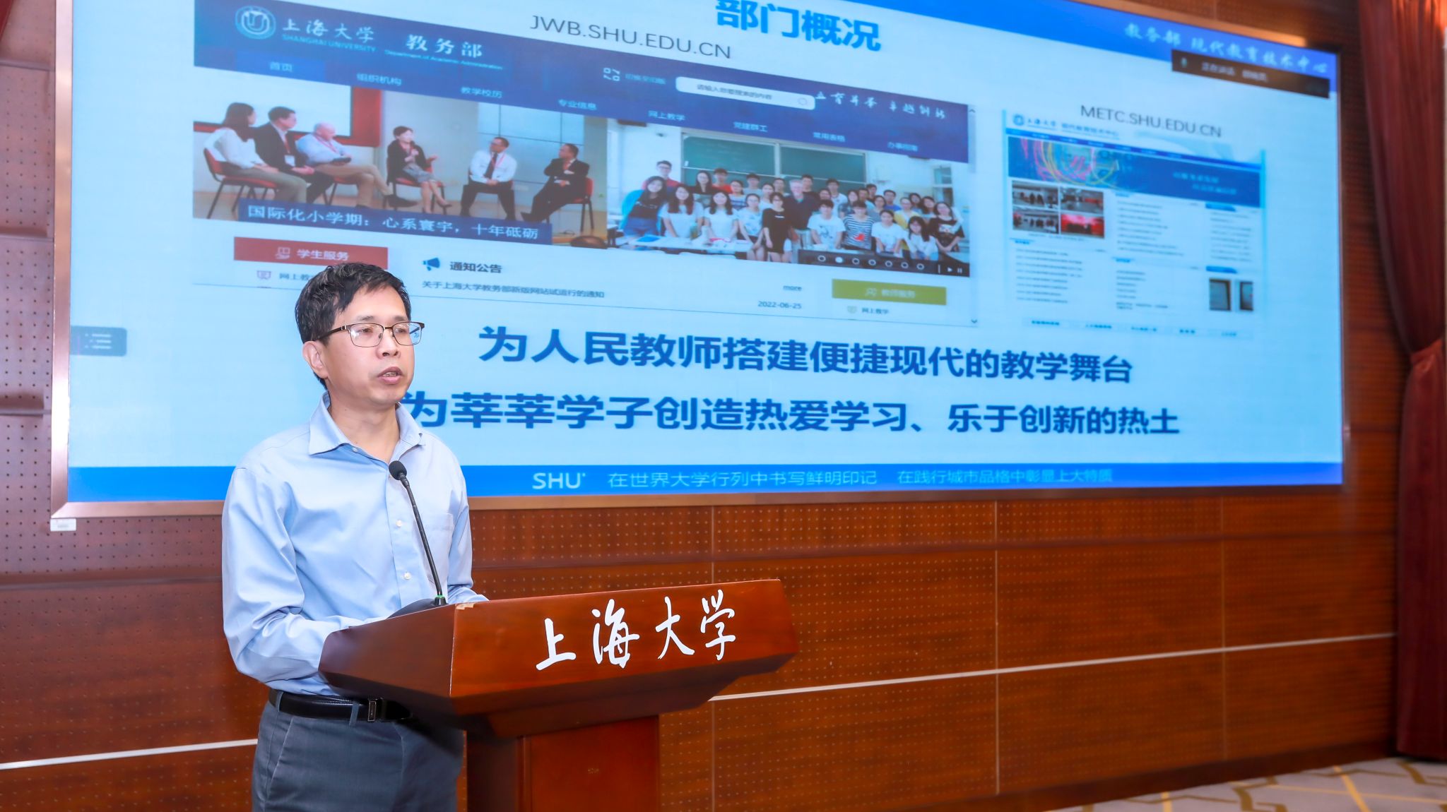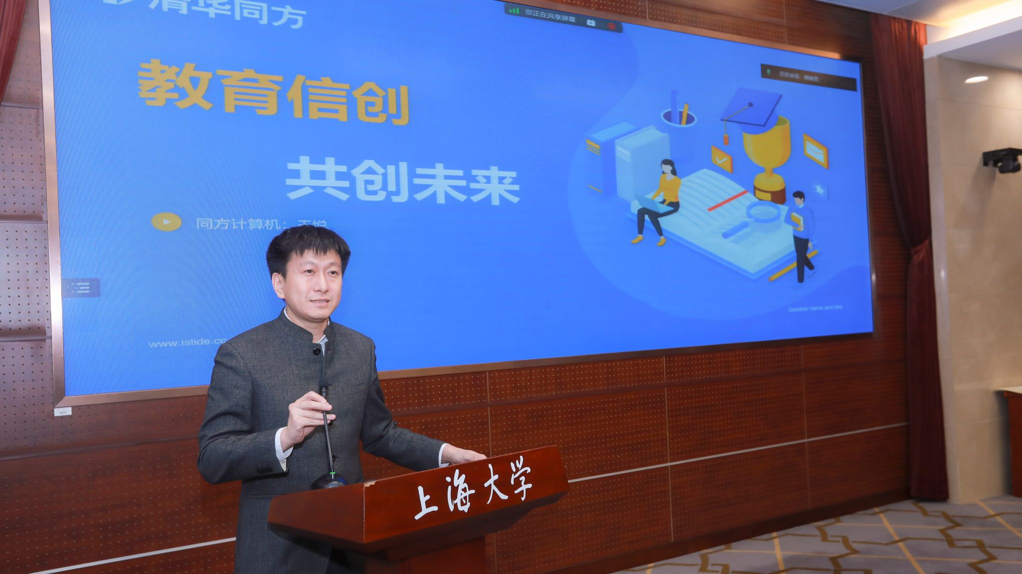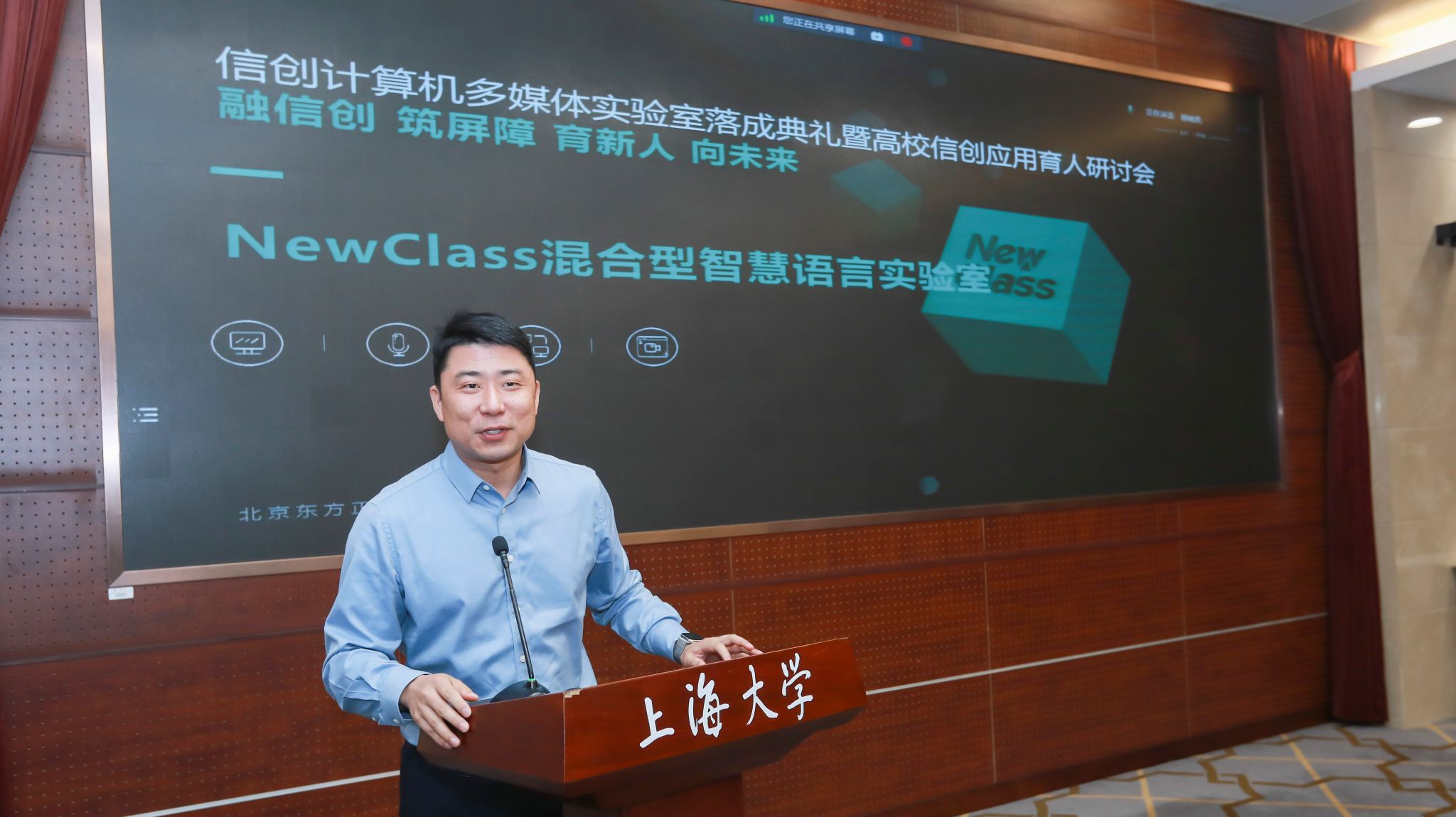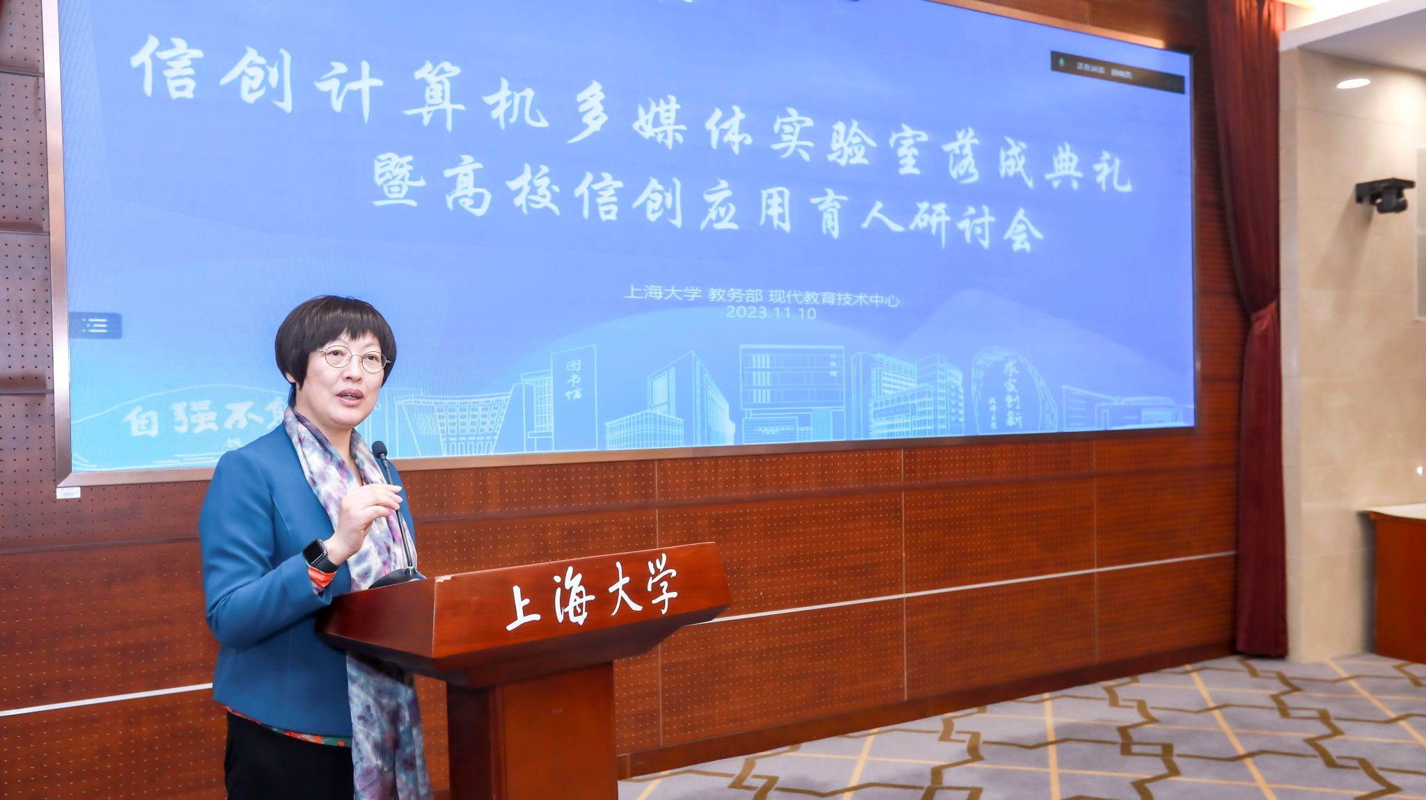 2023年11月10日,上海大学教务部现代教育技术中心(简称现教中心)举办“信创计算机多媒体实验室落成典礼暨高校信创应用育人研讨会”。上海市教委代表、上海大学相关部处领导、信创相关企业代表及上海兄弟高校相关领导出席会议。