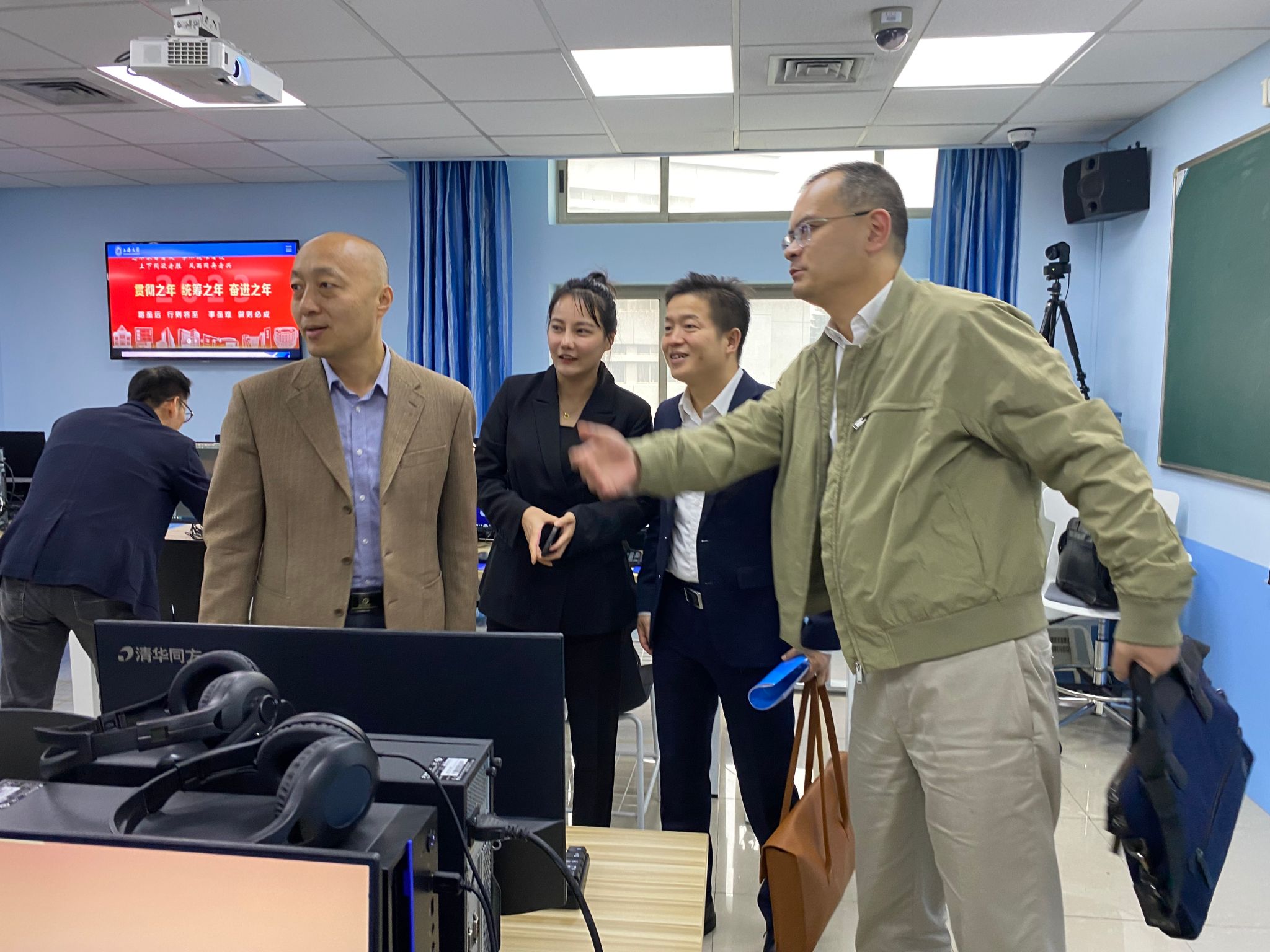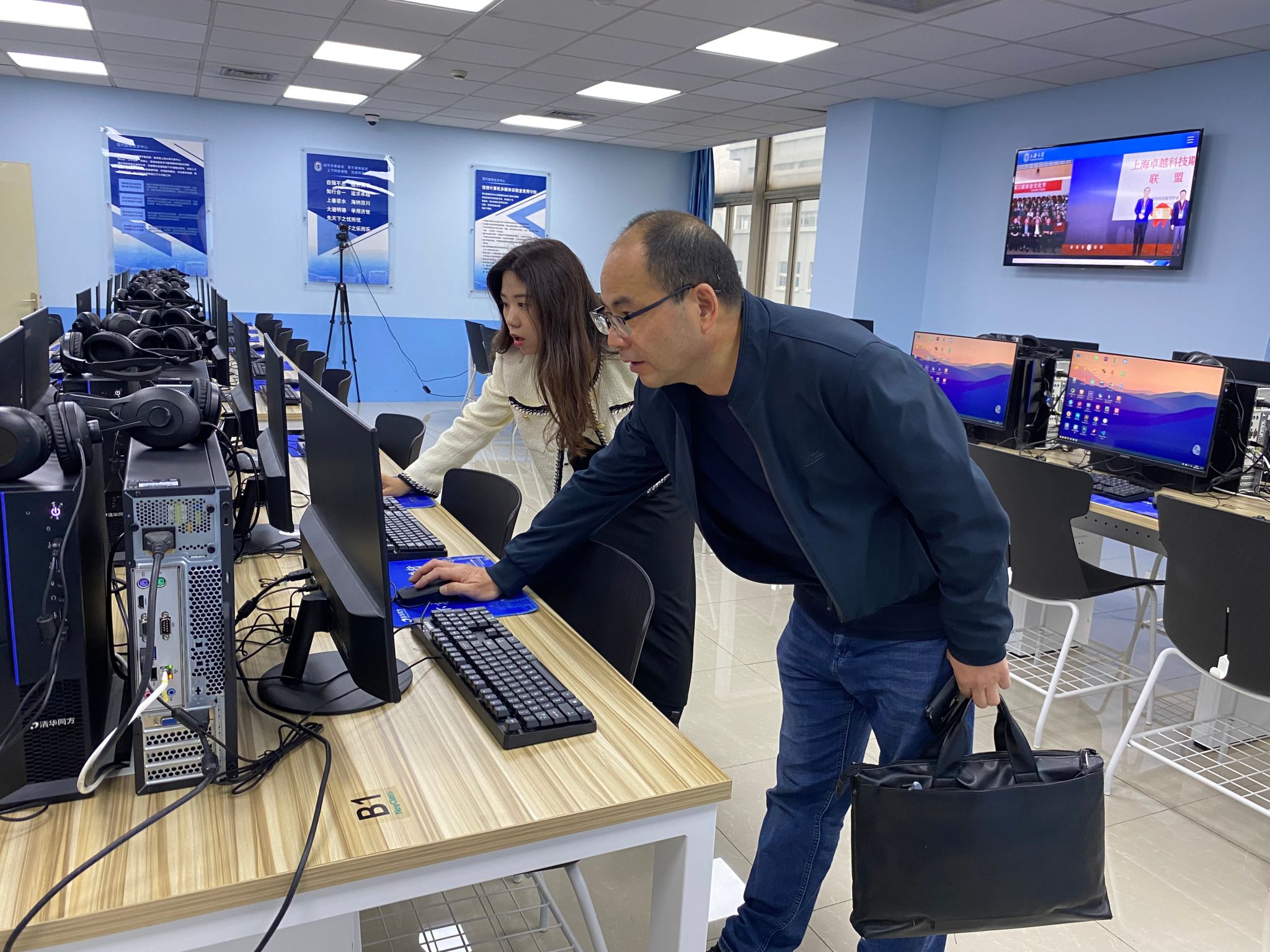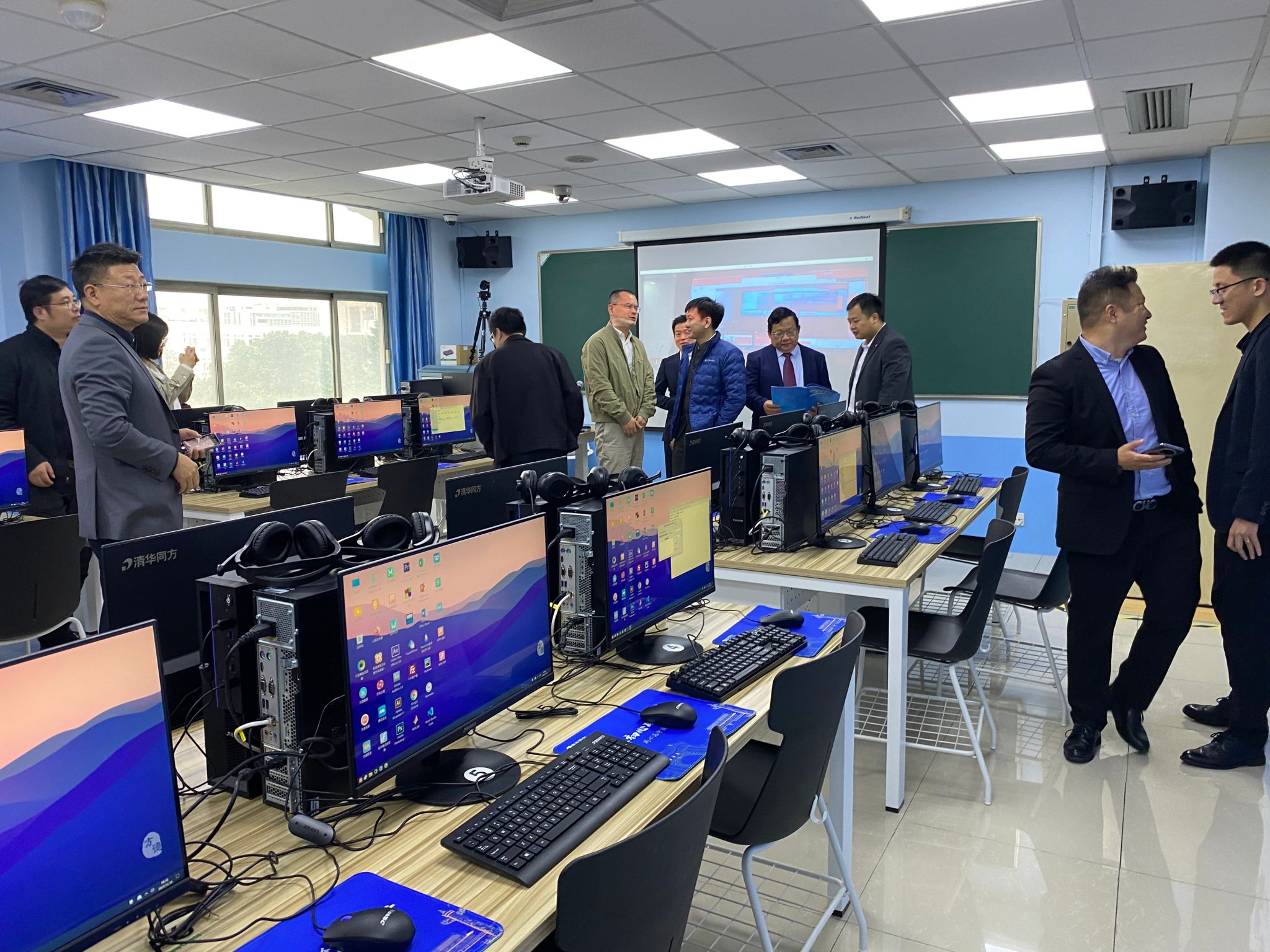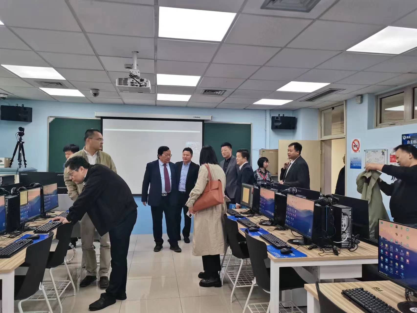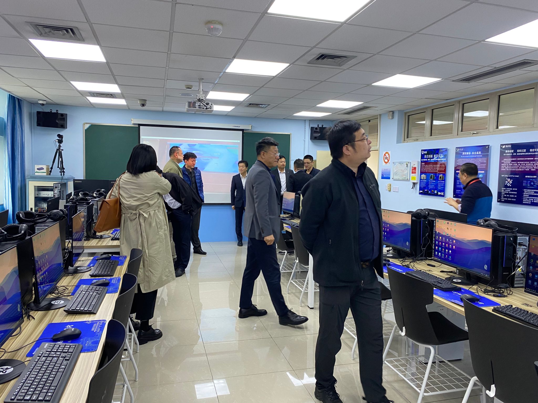 参会人员先行参观了位于上海大学宝山校区C楼422的“信创计算机多媒体实验室”,身临其境地体验信创产品在高校教育领域的产教深度融合。