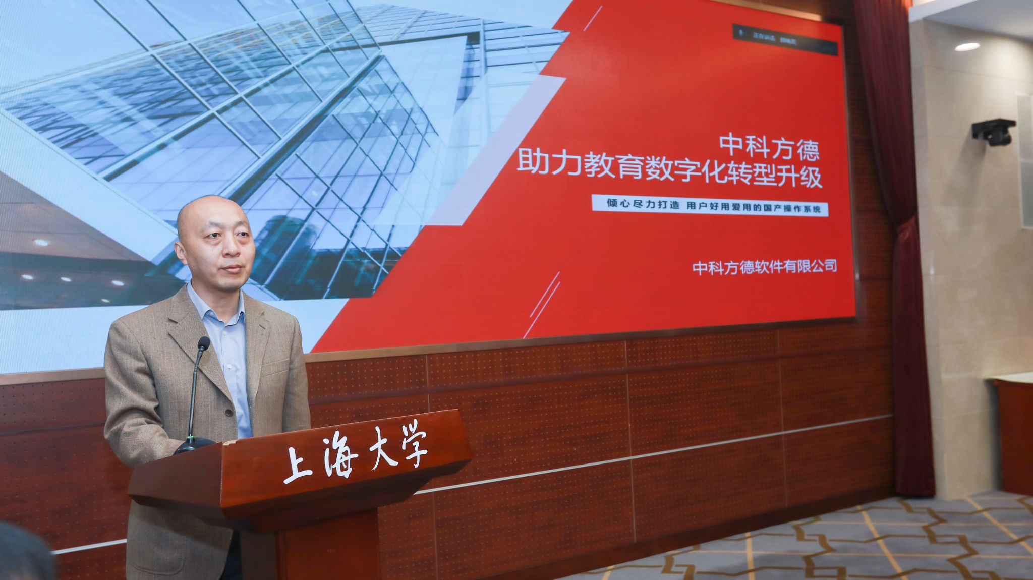 中科方德软件有限公司副总裁杜栓柱介绍中科方德公司概况、重点保障案例,桌面操作系统及教育行业解决方案:教、学、管、考、评,表示中科方德作为软件提供方融入到信创计算机多媒体实验室,希望有更多的机会支撑上海大学的课程体系建设。