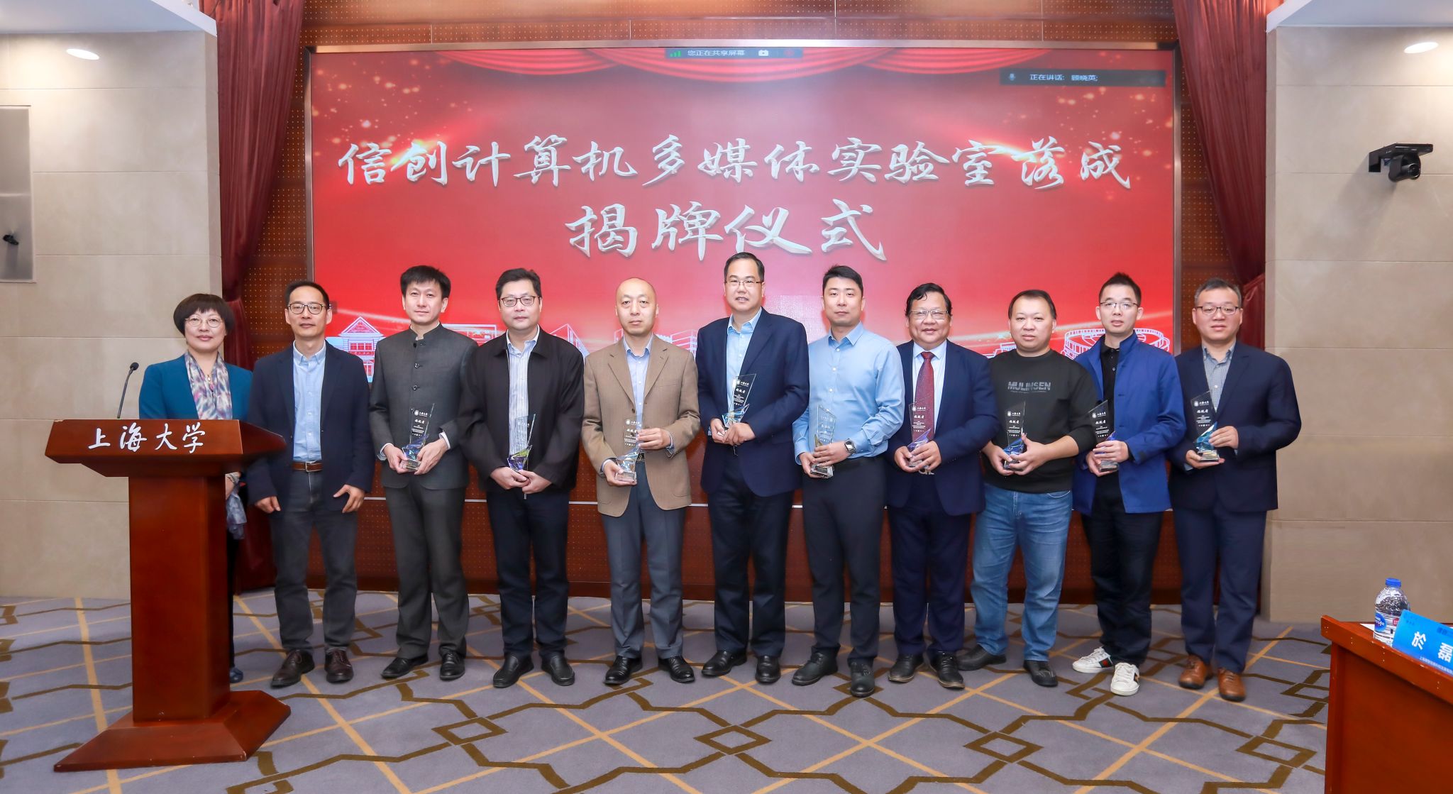 顾老师宣布C422信创计算机多媒体实验室正式落成,邀请教务部副部长杜晓庆等为各捐赠企业颁发“领航者”捐赠纪念奖杯。同方计算机有限公司、上海兆芯集成电路股份有限公司、中科方德软件有限公司、北京金山办公软件股份有限公司、北京东方正龙数字技术有限公司、上海云常信息技术有限公司、永中软件股份有限公司、上海伦伟实业有限公司、上海育智信息科技发展有限公司等企业代表接受奖杯。