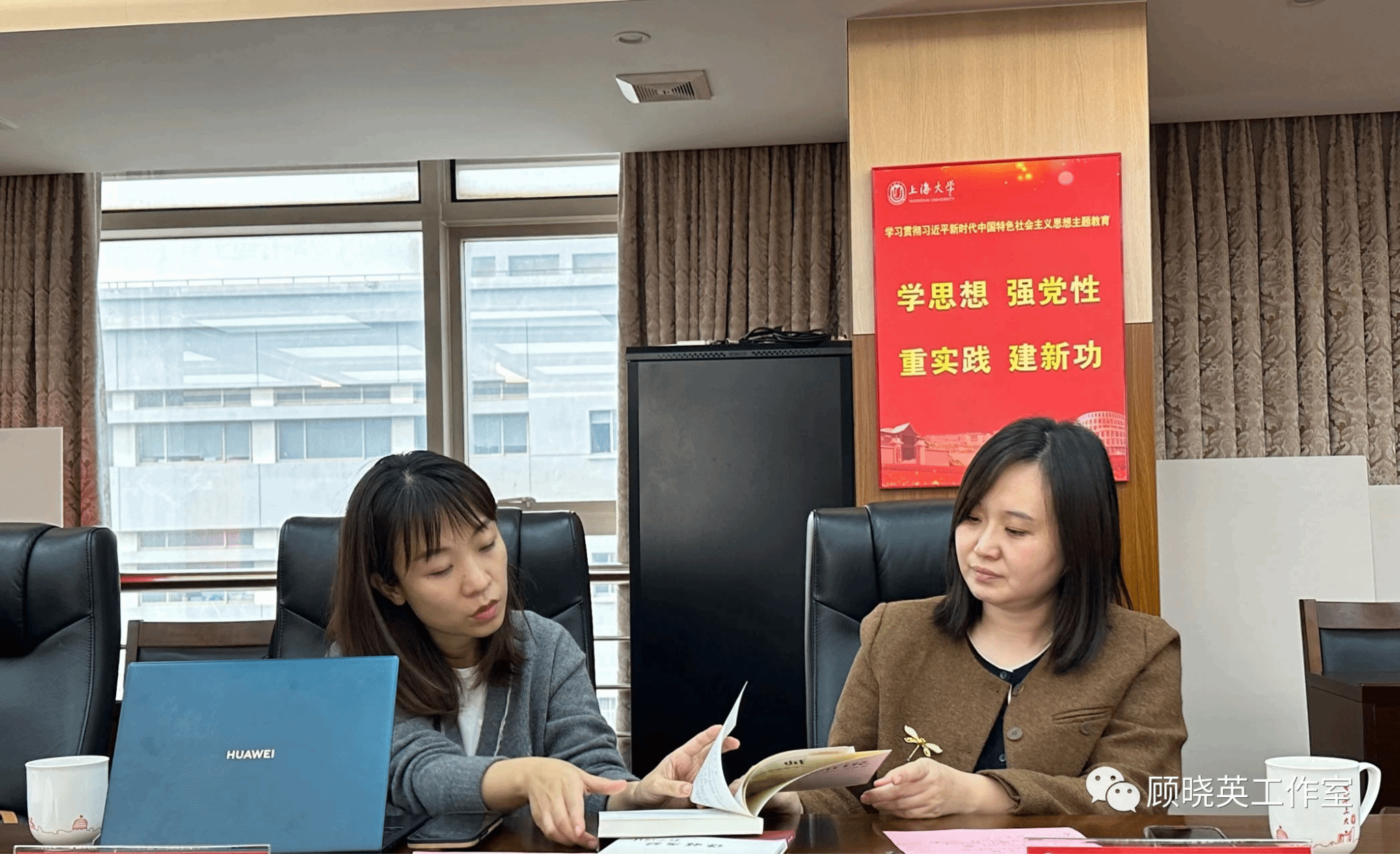 调研会期间,顾晓英副部长给北大同行赠送了上海大学出版社新出版的《媒体中的我们:聚焦上海大学课程思政2022》《师说:课程思政教学设计与思考》两部著作。北大于菲副主任也回赠了北大校史、课程思政教学案例著作。