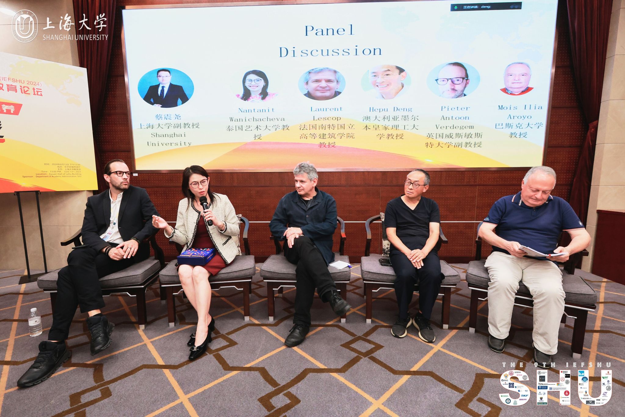 在互动问答环节,泰国艺术大学Nantanit Wanichacheva教授、法国南特国立高等建筑学院Laurent Lescop教授、澳大利亚墨尔本皇家理工大学Hepu Deng教授、英国威斯敏斯特大学Pieter Antoon Verdegem副教授以及巴斯克大学Mois Ilia Aroyo教授与现场及在线师生针对人工智能等前沿技术对于未来人类教育尤其是教学模式的深刻影响、教师的角色和职责应该如何演变等等问题展开互动与交流,学者们分享自身经验、积极各抒己见,气氛活跃。