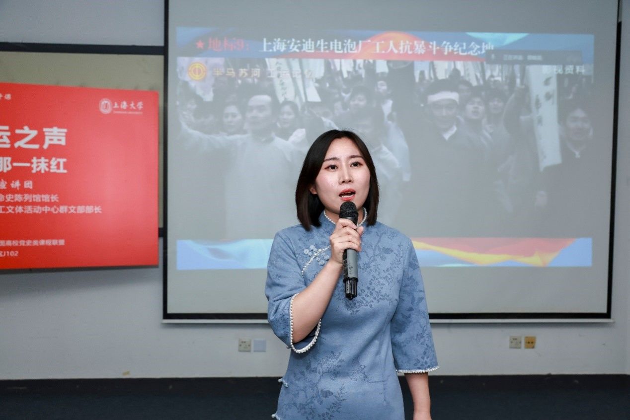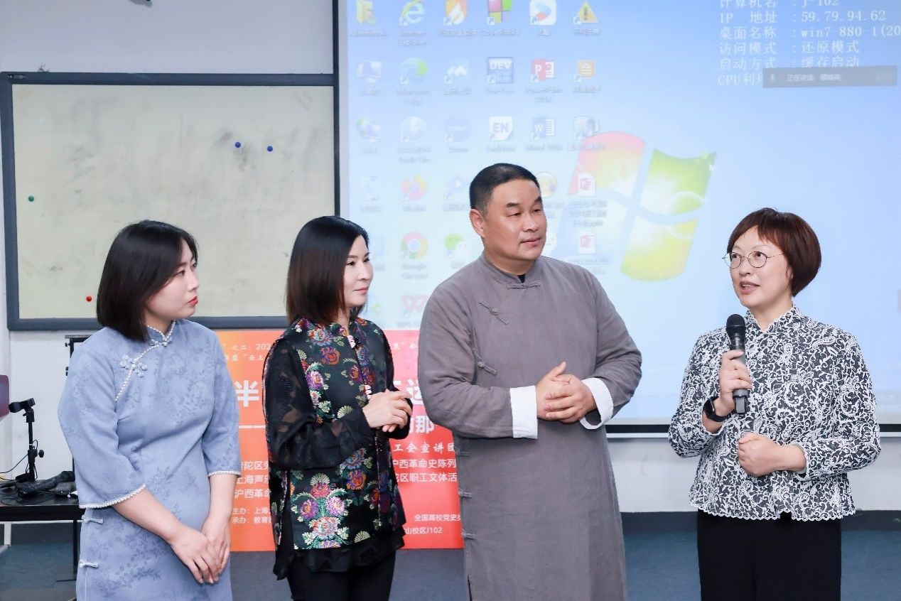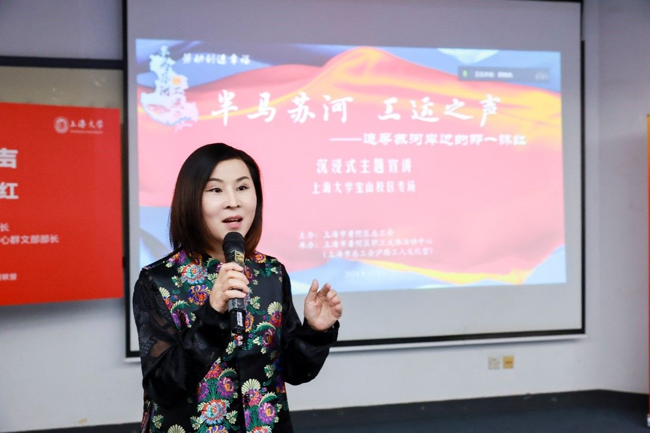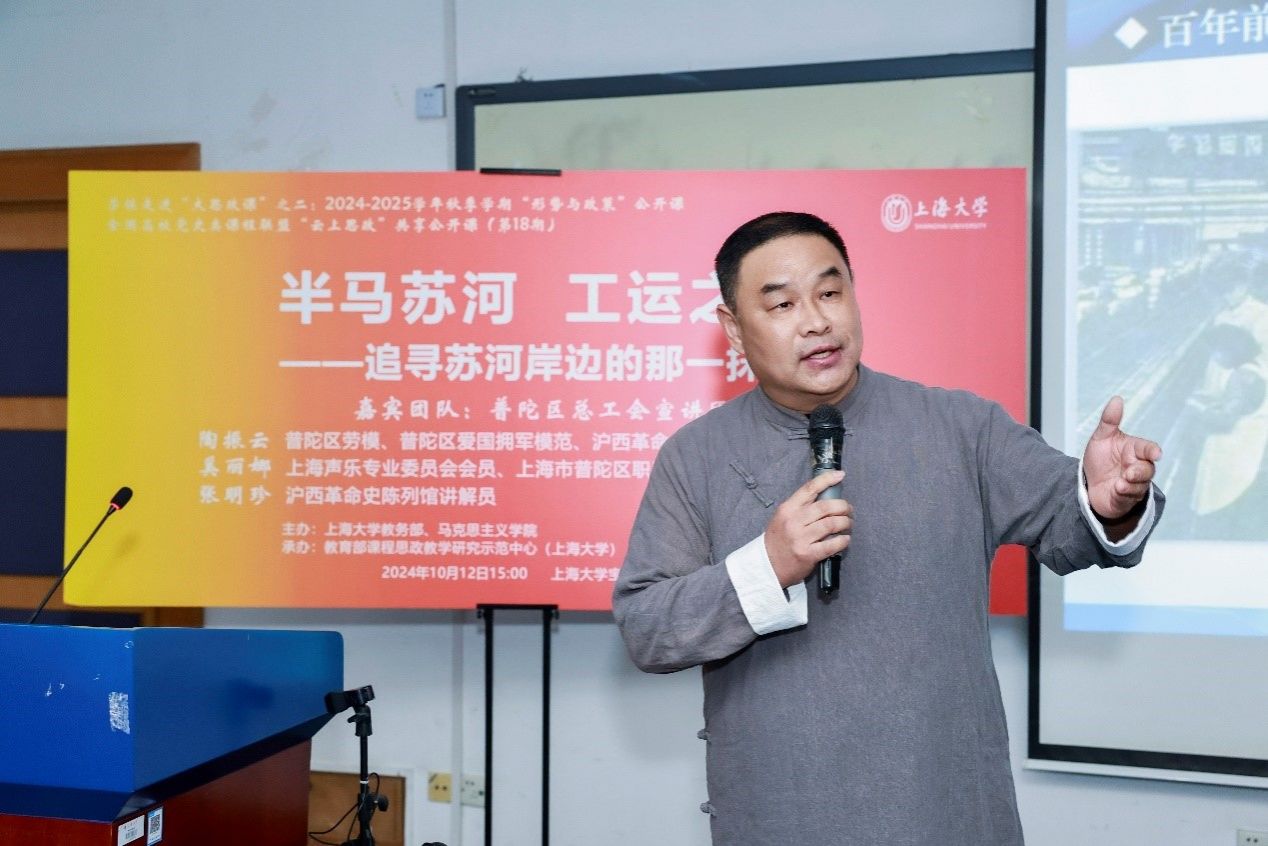 2024年10月12日下午,一堂名为“半马苏河,工运之声”的“形势与政策”思政大课在上海大学宝山校区J102开讲。课程由普陀区总工会宣讲团的普陀区劳动模范、普陀区爱国拥军模范、沪西革命史陈列馆馆长陶振云,上海声乐专业委员会会员、上海市普陀区职工文体活动中心群文部部长奚丽娜,沪西革命史陈列馆讲解员张明珍等担任嘉宾主讲。本次课旨在深化活化爱国主义教育,赓续红色血脉,弘扬劳模精神,课馆协同育人讲好“大思政课”。公开课由上海大学教务部、马克思主义学院联合主办,教育部课程思政教学研究示范中心(上海大学)、全国高校党史类课程联盟联袂承办。教育部课程思政教学研究示范中心(上海大学)负责人顾晓英、教务部教学运行处处长袁晓君全程参与互动。