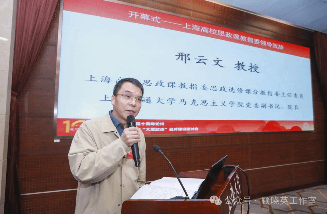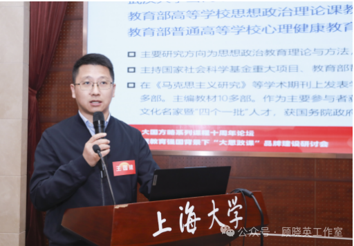 上海高校思政课教学指导委员会思政选修课分教指委主任委员、上海交通大学马克思主义学院院长邢云文教授致辞。他说,这场研讨会不仅是大国方略课程建设纪念会,也是上海市思政选修课教指委的重要活动。从上海大学一家的大国方略课,演化成整个上海市的中国系列课,到正在推进的中国系列课程的升级版强国系列课,这一系列的后续改革措施都跟最早开设的大国方略课有关。这次回顾大国方略课十周年研讨会,总结其影响整个思政课乃至课程思政和大思政课的探索经验,尤其是在“大思政课善用之”怎么用这个问题给出上海的一些方案。