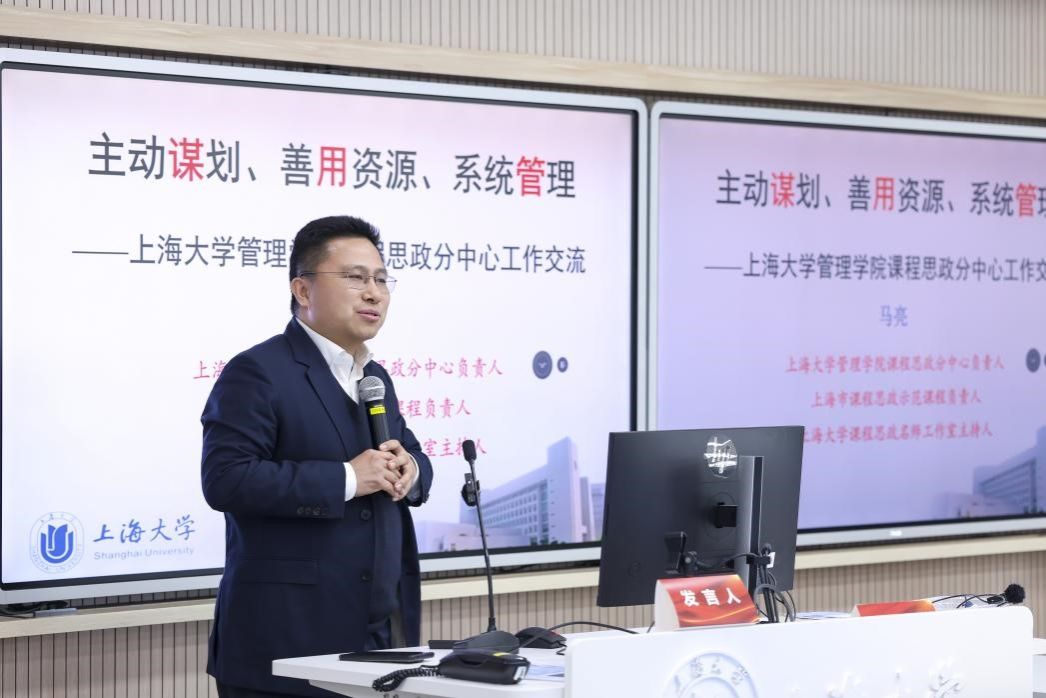 上海大学课程思政名师工作室主持人,管理学院党委副书记、副院长马亮分享了自己在学习两会最新精神中的思考,介绍了管理学院课程思政教学研究分中心建设情况。学院通过主动谋划、善用资源、系统管理等策略,将课程思政与大思政课协同推进。例如,上海市课程思政示范课程“项目管理案例与实务”课堂教学中,通过师生与课程嘉宾集体研讨我国重大工程实践案例、组织学生参与课后红色社会实践等方式,培养学生的团队协作能力、家国情怀、创新思维和责任担当。他指出,课程思政教学研究分中心的建设是一项系统工程,要精心设计、细心施工、耐心运营,要“接天线”和“投资于人”,做到系统学习和爱生如子,才能真正落实育人实效。
