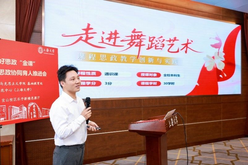 上海大学音乐学院还国志老师以“走进舞蹈艺术”为例,展示“美育+思政”的创新实践。他打破传统舞蹈教学框架,将《只此青绿》《丝路花雨》等作品与“两山理论”“一带一路”精神深度融合,通过“课堂实践+户外体验+朋辈互助+AI技术”的立体教学模式,让学生在肢体律动中感悟文化自信。用力学解析“青绿腰”、用心理学阐释舞蹈疗愈的“舞蹈+学科”的跨域探索,展现了通识课程“通而有魂”的育人魅力。