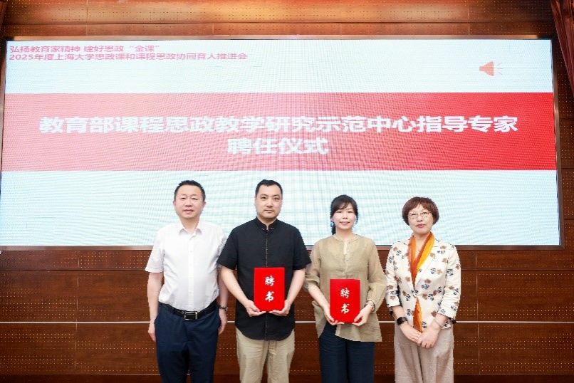 曹为民部长为教育部课程思政教学研究示范中心(上海大学)指导专家王轶卿、周征宇颁发聘书。