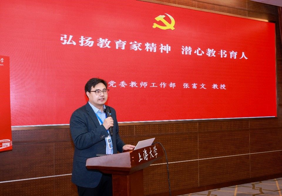 会议以“第一议题”学习拉开帷幕。党委教师工作部副部长、马克思主义学院教授张富文围绕“弘扬教育家精神,潜心教书育人”作专题分享。他指出,习近平总书记对“思政课程与课程思政同向同行”的论述深化了育人理念,上海大学以钱伟长教育精神为标杆,将师德师风建设融入全面从严治党体系,通过“1+1+N”思政工作制度、全程导师制等举措,构建“政治性、人民性、战略性”三位一体的育人格局。他强调,教育强国战略下,高校需以“思政引领力”为核心,统筹“教育、科技、人才”一体化发展,培养具有“六大特质”的卓越创新人才。