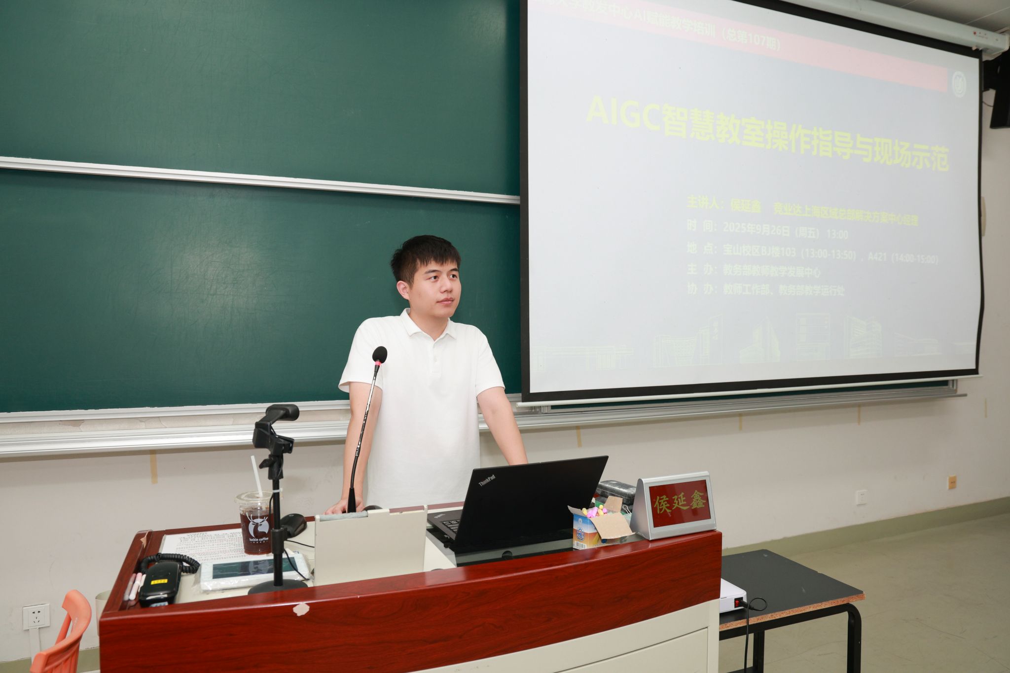 2025年9月26日下午,为加快推进智慧校园建设,提升教师信息化教学能力,充分发挥新改造智慧教室的育人效能,学校教师教学发展中心联合教学运行处、现教中心在宝山校区组织开展了“AI智慧教学平台的现场示范”专题培训。教务部副部长、教发中心主任辛明军、现教中心主任陈章进以及合作方代表于若殷经理出席了本次活动。培训由教发中心黄微老师主持,吸引了来自本学期在此类教室授课以及各学院的近30位教师积极参与。