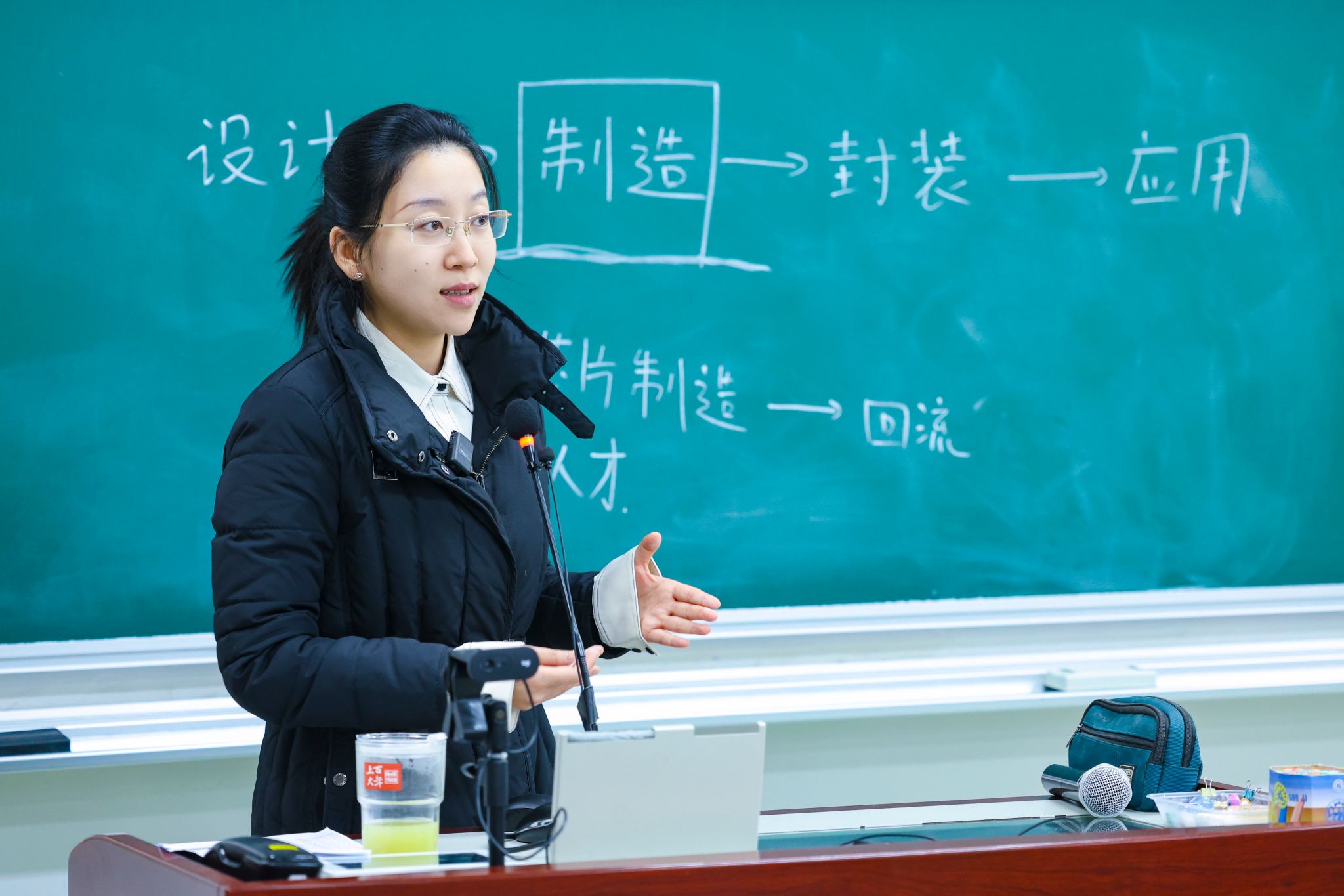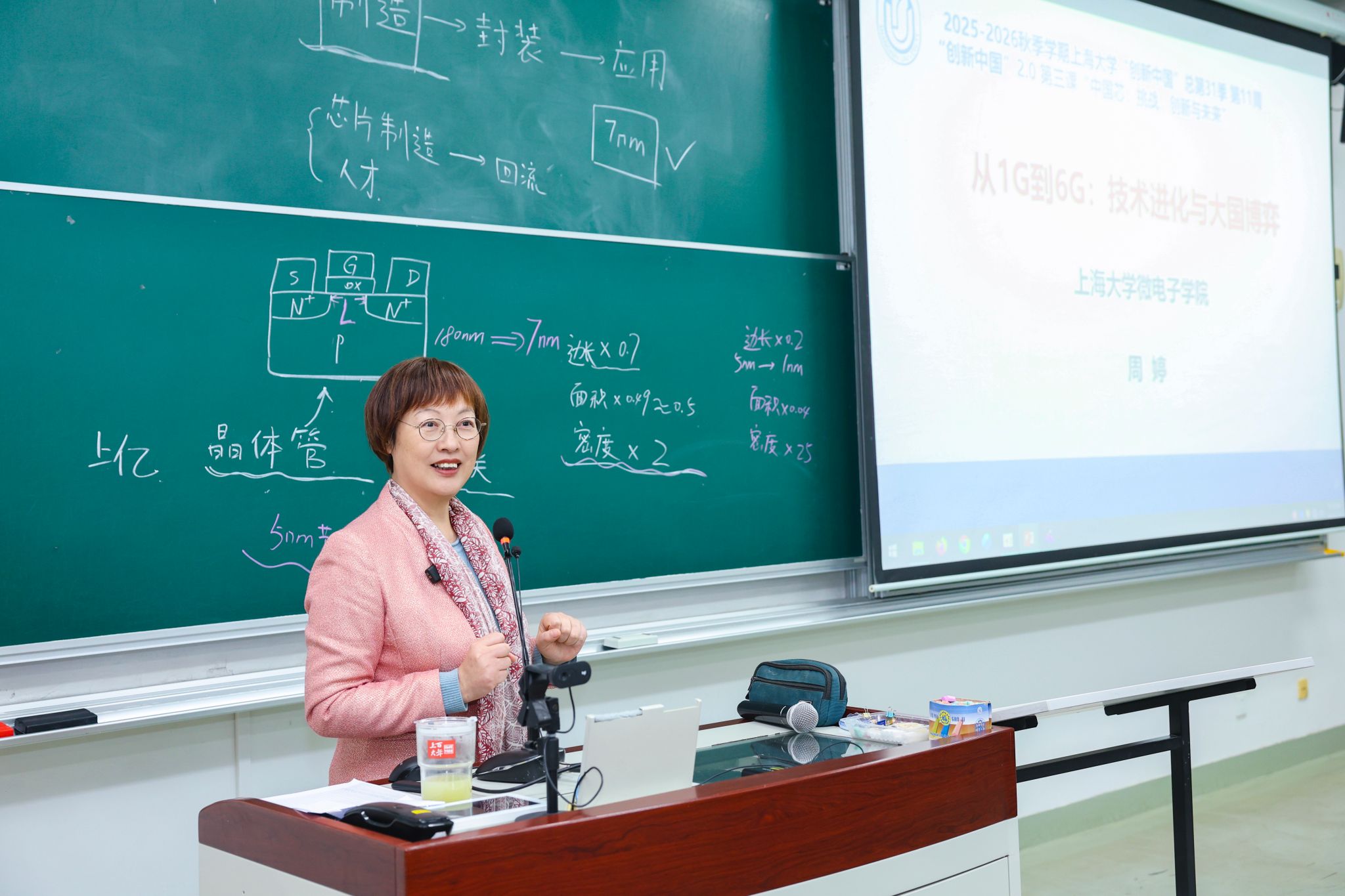 “从5nm到未来的1nm,芯片集成晶体管的密度如何实现25倍跃升?”任开琳老师以芯片制程为切入点,揭开集成电路制造的神秘面纱。任老师从摩尔定律的核心逻辑讲起,用清丽的板书,工整的算式,描摹了“边长缩小0.7倍,面积缩减0.49倍,密度提升2倍”,让学生直观理解集成电路制程迭代的核心原理。她介绍了英特尔22nm节点采用的三维包围式晶体管结构的技术突破,分享了这一技术从1999年概念提出到2015年量产应用的漫长历程,诠释了“基础研究需要坐得住冷板凳”的科研精神。针对我国集成电路产业的发展现状,任老师提到,华为麒麟990芯片早于2019年就实现了7nm设计能力,如今我国集成电路产业链正加速完善,但核心人才匮乏仍是突出瓶颈。为响应国家与上海的需求,上海大学正加速布局微电子领域人才培养。任老师呼吁同学们关注微电子学科,选择微电子专业,有志于在芯片设计、制造、封装测试等领域深耕细作,用专业能力为产业升级赋能,期待更年轻的一代人能有更好的价值观、更开阔的视野、更高的创造力。