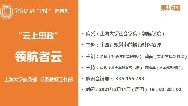 2021年全国两会闭幕,两会内容及2021年两会会议决策重点内容成为上海大学教师们关注的要点和热点问题。3月11日晚,上海大学举办第16期“学党史 融‘四史’周周见”领航者云教师分享,上海市课程思政重点改革领航学院——社会学院金桥副教授和美术学院魏秦副教授联袂围绕“改善人民生活品质,提高社会建设水平”线上畅谈“十四五规划中的城市社区治理”。两位老师分别从各自研究方向从“社会学”“建筑学”视角谈课程中的“城市社区治理”“城市空间规划”等问题。本期活动由社会学院承办,校教务部副部长顾晓英教授和社会学院党委书记沈艺联袂主持。