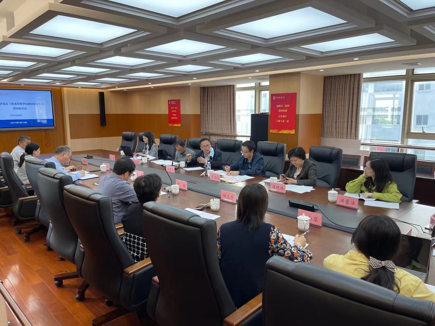 随后,调研组一行人出席了《普通高等学校教材管理办法》调研座谈会,我校副校长聂清、教务部常务副部长彭章友、宣传部副部长吴铭、研究生院培养管理处处长毛建华、教务部教学建设处处长杨昕昕、上海大学出版社总编辑傅玉芳、马克思主义学院马克思主义中国化教研部主任申小翠等出席了座谈会。彭章友副部长主持了会议。