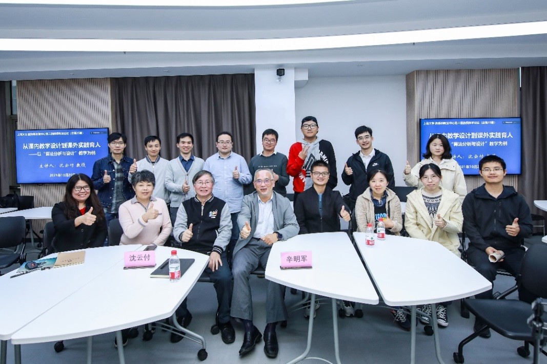 10月20日下午,为进一步落实本科教育大会精神,教务部教师教学发展中心以教学法探究为主题,在宝山校区B楼316教室举办第二期教授教学论坛,引领教师通过教学方法的改革和课内外联动的教学模式探索,尤其是提升青年教师的教学能力。本次论坛特别邀请了我校首批教学型教授、计算机学院的沈云付教授为大家分享“从课内教学设计到课外实践育人”的课堂教学经验与体会。本次论坛由辛明军教授主持,同步开通腾讯会议线上直播。教务部副部长、教发中心主任辛明军,教发中心副主任袁晓君以及来自计算机学院、中欧学院、力工学院的教师们近30人通过线上、线下方式参加了本次活动。