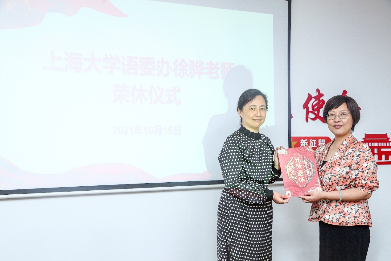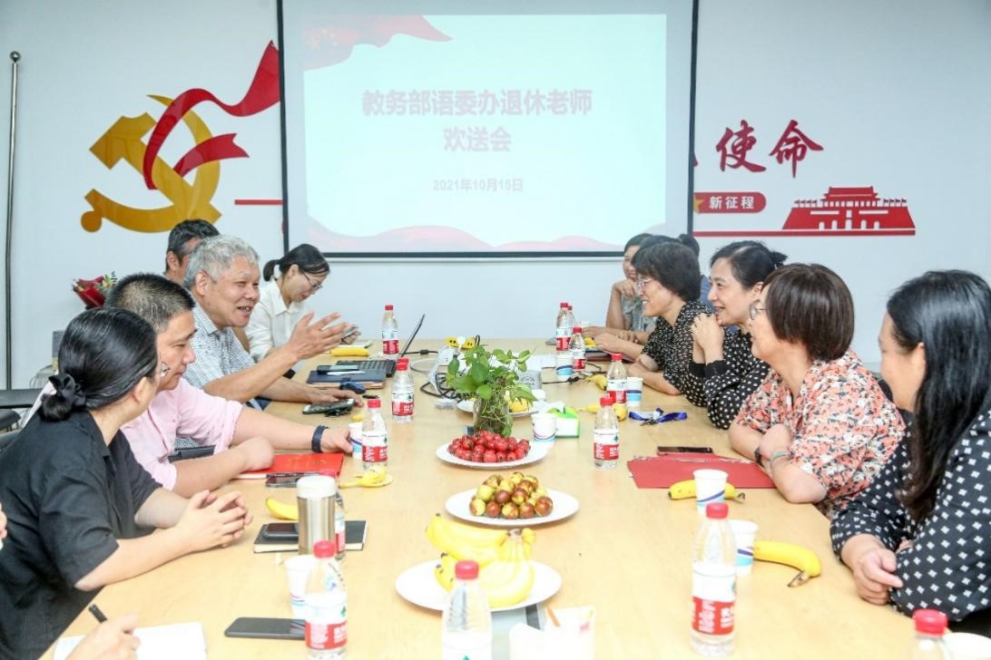 语委办徐骅老师即将荣休。教务部和语委的同事为徐老师准备了精美的纪念卡和鲜花。大家回忆过往在一起工作、学习的点点滴滴。徐骅老师激动地回顾了自己工作30余年的经历。从国商学院到教务部,从研究科到语言文字办公室,她热爱本职工作,始终不断地自我加压。近年来,无论是组织语言文字各类精彩的推广活动,还是周末普通话测试,“啄木鸟”文字纠错活动等,她一直专注于推广普通话工作。感慨之余,徐骅老师畅想了荣休后的崭新生活。最后,她用《再别康桥》诗句,表达了对学校与部门同事的感激与不舍。