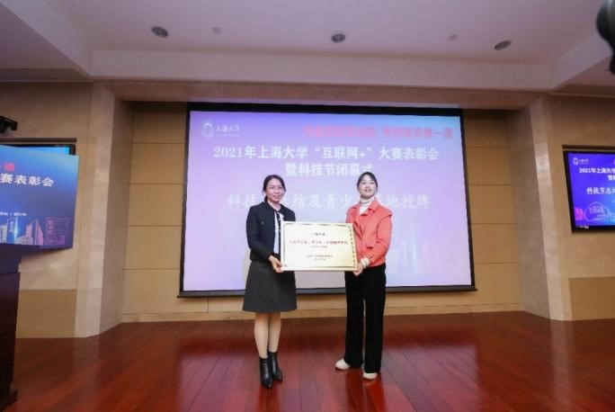 表彰仪式后,校团委书记冯凌燕介绍了2021年上海大学科技节开展情况。冯老师回顾了历时1个多月的科技节系列活动,期间举办了科创类讲座11场、科创竞赛类7项、参观交流类9项、交流沙龙类9项,共计36场活动,勉励全体学生积极投身科研、创新、实践活动中,共同打造有创新活力的校园文化。此外,今年我校在“挑战杯”等学科竞赛中均取得优异成绩,并获得首批上海市学生(青少年)科创教育基地,以及上海市创业指导站A级。现场冯老师为青少年科创教育基地授牌。