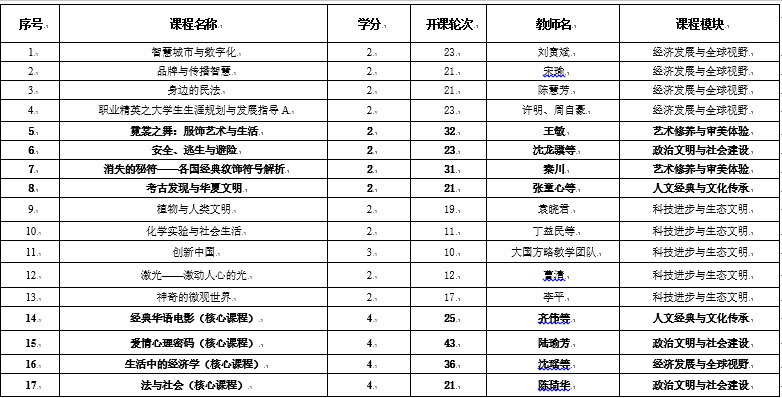 一批长期以来默默耕耘在通识教育战线的名师优课正在涌现。近期,教务处梳理了全面实施通识教育以来8年23个学期开课数据、18个学期大类学生评教数据,公布了17门开课频次高、学生评教好、专家考评成绩优良的通选课和核心通识课(按“三大类”和“核心课程”区分)。教务处还邀请设计师为“那些年那些课那些老师”精心设计了荣誉勋章和证书。