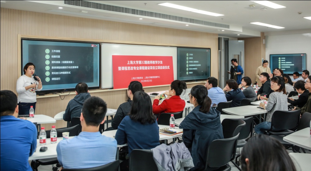 为深入推进我校课程思政教育教学改革,激发更多教师发挥出投身课程思政的主动性、积极性和创造性,4月23日上午教务处借B319——“八屏”智慧教室举办我校第32期教师教学沙龙暨课程思政专业课程建设项目立项启动仪式。本期沙龙由上海大学教务处副处长、上海市思政课“顾晓英工作室”主持人顾晓英主持。