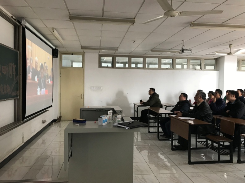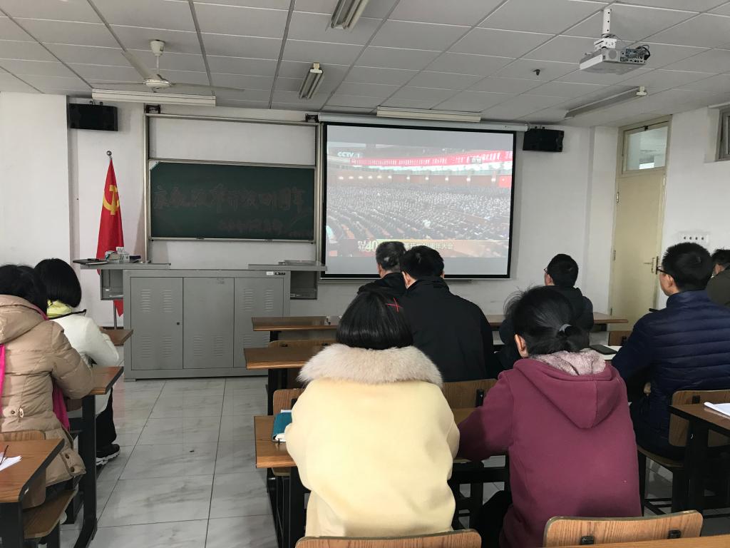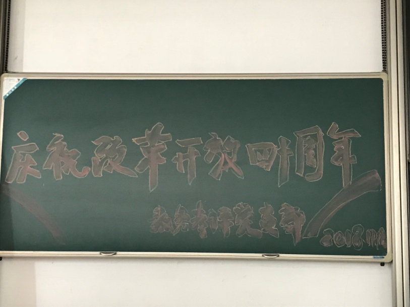 12月18日上午,上海大学教务考评党支部认真贯彻校党委要求,全体党员集中宝山校区A415教室,同步收看了在北京人民大会堂隆重举行的庆祝改革开放40周年大会直播。黑板上支部书记顾晓英同志早早写上“庆祝改革开放四十周年”字样,考评办主任辛明军同志则勾线字样,为观看活动营造了良好氛围。聂清党员、彭章友党员、许科党员、倪建妹党员、邓斐今党员、万金雷党员等分别在各自不同工作岗位用手机或笔记本电脑因地制宜开展了收看直播活动。