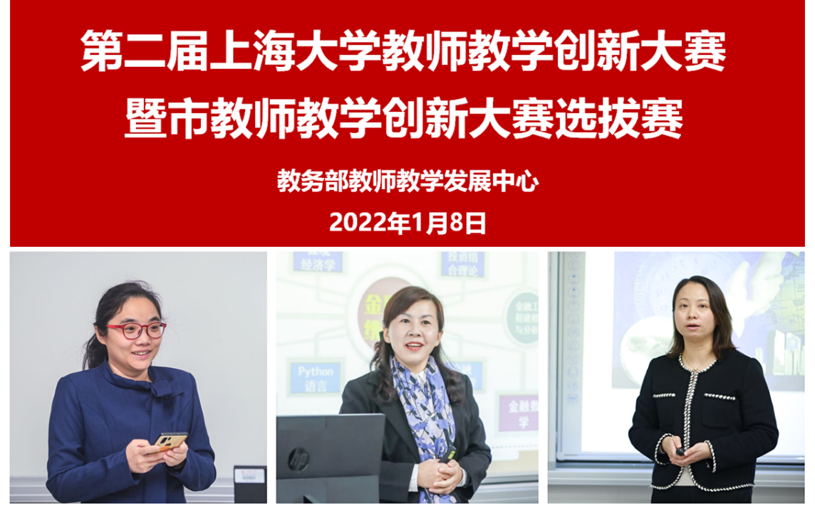 2022年1月8日下午,为推动我校教师教学创新能力的提升和选拔第二届上海市高校教师教学创新大赛参赛选手,学校在B楼举办第二届上海大学教师教学创新大赛创新汇报答辩暨市赛选手选拔赛。本次赛事邀请了来自复旦大学、上海交通大学、同济大学、华东师范大学、上海财经大学、华东理工大学、上海外国语大学以及上海大学的9位专家担任评委,来自华东理工大学的黄婕教授担任本次比赛的专家组组长。比赛按照市赛要求分为正高组、副高组和中级及以下组三个赛道进行,31位入围校赛的选手参加了本次比赛。来自教务部的辛明军老师、杨昕昕老师和袁晓君老师分别担任了三个组别的赛场主持人。