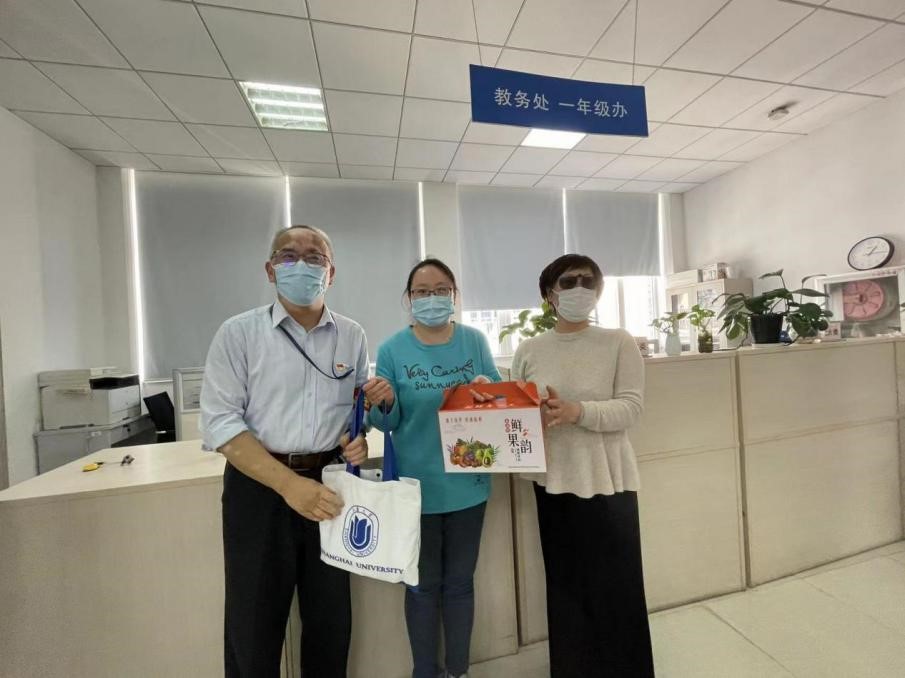 在主题党日座谈会前,顾晓英和辛明军两位老师代表教务部班子给一年级办的姚小洁老师带去集体的慰问。姚小洁老师自2011年社区学院成立开始派驻到学院从事本科一年级学生的日常教学管理工作,为配合学校疫情防控要求,此次与校内其他70余名老师一起进行了为期7天的自我隔离健康管理,通过这次心连心的慰问,帮助她精神饱满重新投入到抗疫工作状态中。