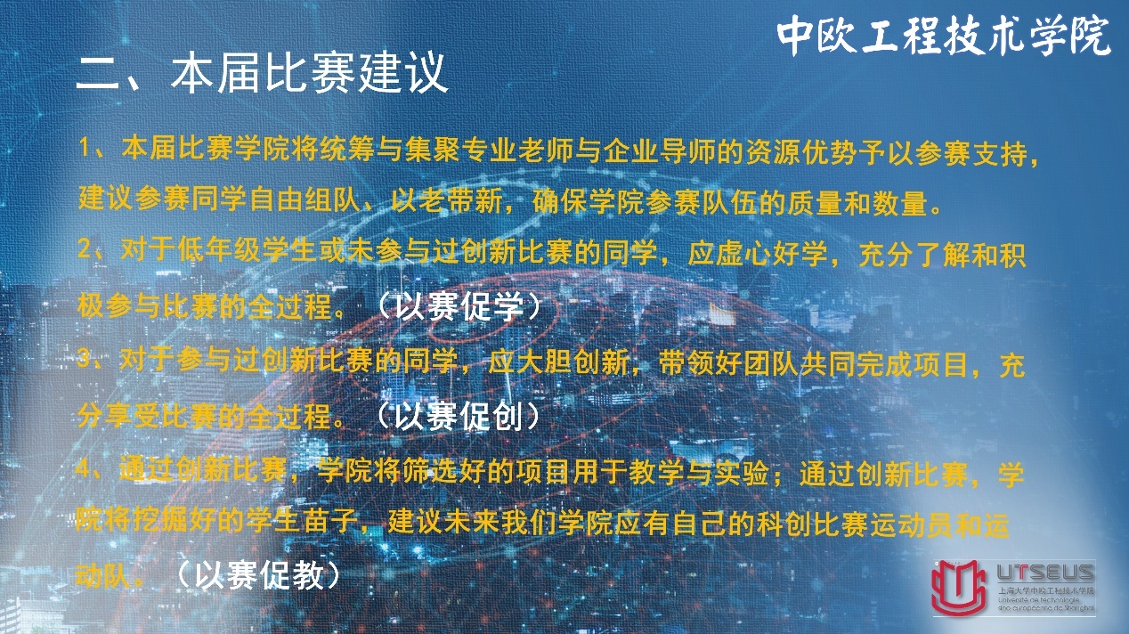 接下来,中欧学院物联网大数据实验室主任谢海华老师带领同学们回顾了上届赛事,为本届大赛提出来以赛促学、以赛促创、以赛促教的参赛建议。结合中欧学院的培养目标和办学愿景,谢老师指出参加创新创业大赛对于以工程师为目标的中欧学子的实践意义。