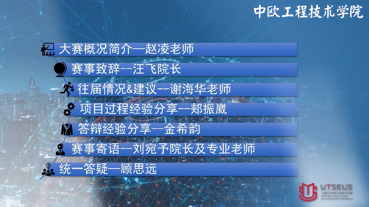最后,中欧学院在读研究生顾思远以从大赛组委的角度,在“学院支持”、“比赛建议”以及“参赛答疑”等方面为同学们明确了学院对于大赛的资源与师资的保障支持,在组委会的建议基础上同学们答疑解惑。