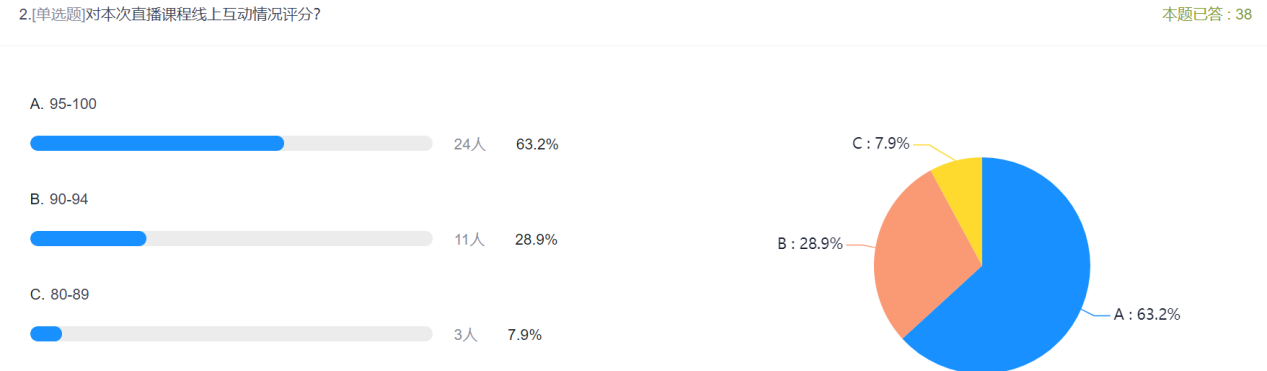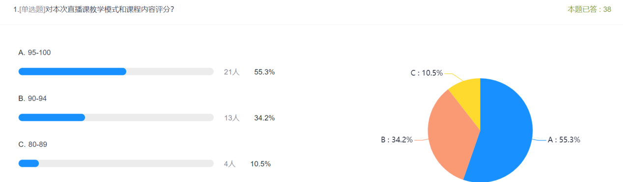 “云上实习”课程第一天共计216名同学参与,同学们对课程安排、内容以及优越的实训环境、先进的实训设备都表现出极大的兴趣,线上互动活跃,大大激发了同学们的学习热情。课程结束后面向所有同学从课程模式、主讲讲师及课程建议等方面进行了问卷调查,从调查结果可以看出学生总体满意度较高,所提出的建议为后续课程改进提供了依据。
