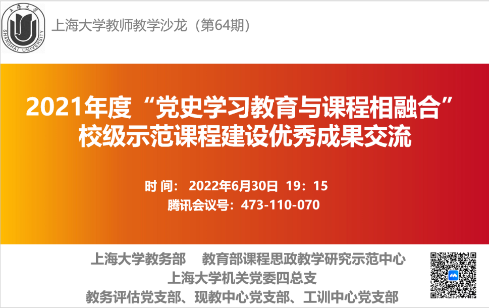 为迎接中国共产党的第101个生日,6月30日晚,上海大学2021年度“党史学习教育与课程相融合”示范课程建设优秀成果交流暨第64期沙龙在线上举行。沙龙由上海大学教务部、教育部课程思政教学研究示范中心主办。上海市党史学会副会长、上海立信会计金融学院教授徐光寿,《上海宣传通信》编辑部主任吕东卉担任点评嘉宾。作为上海大学机关党委四总支三个支部的主题党日活动学习内容,教务评估支部、现教中心支部、工训中心支部的党员们同步线上参与。本次交流累计172位教师参加。