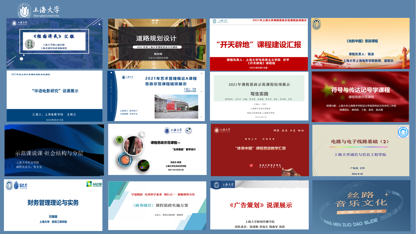 2019年以来,学校加大力度持续开展课程思政领航校建设,每年重点支持建强美术学院、社会学院、理学院、经济学院、文学院、材料学院、机自学院等7个市级领航学院、“创新中国”等122门市级领航课程。连续三年,经遴选、立项、培训、验收各环节,着力建设“科技与伦理”等44门校级课程思政示范课程。2021年,上海大学获评教育部课程思政教学研究示范中心(全国本科高校共15所,唯一地方高校)。2022年,中心编撰出版《课程思政教学设计》一书,汇集上海大学课程思政示范课、领航课程教学案例。