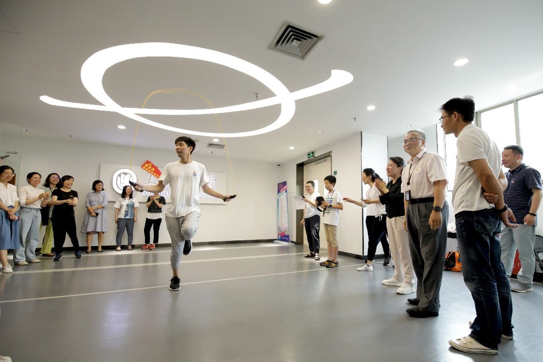 第二阶段为青春向党的联谊对抗活动。两个支部提议在行政楼二楼大厅举行了别开生面的跳绳比赛,每个支部选取12位队员,各分为三组,每位队员完成1分钟计时跳绳比赛,通过约50分钟的比拼,决选出本次联谊活动的优胜者和团体获奖者。其中,教务评估支部以总数超越国际合作处支部;个人最佳选手由国际部李珊珊老师夺得,教务部丁琳、郭敏分别获得第二名和第三名。通过这次友谊比拼,极大鼓舞了各位同事的运动热情,校领导亲临现场观战,也把这次青春向党的活动推向了高潮,各位同仁的精神面貌也得到了升华。