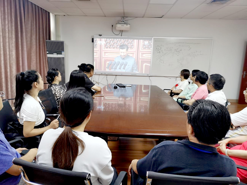 2021年7月1日上午8点,现教中心的党员们在会议室共同收看“庆祝中国共产党成立100周年大会”直播。还有坚守在公共机房、多媒体教室、控制室等的提供技术支持的党员和教师们,在各自的岗位上同步观看大会的网络直播。