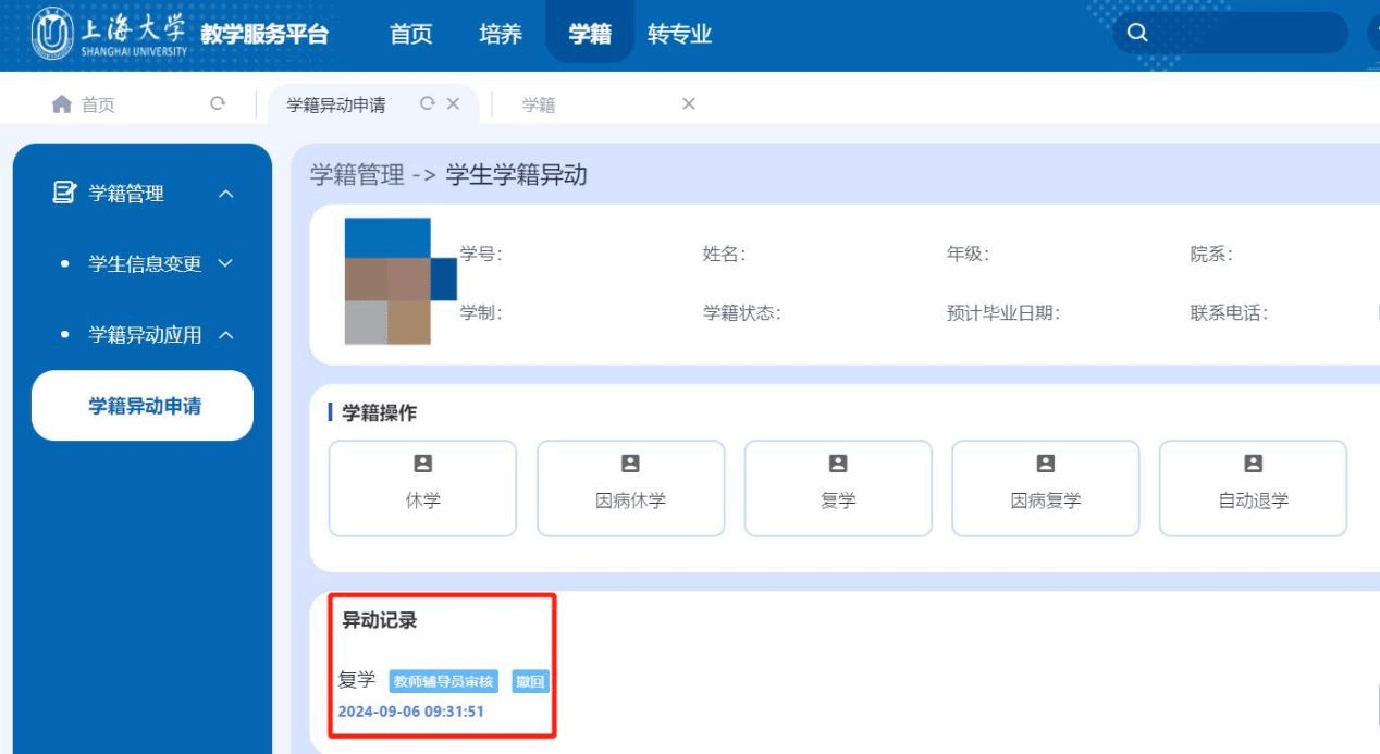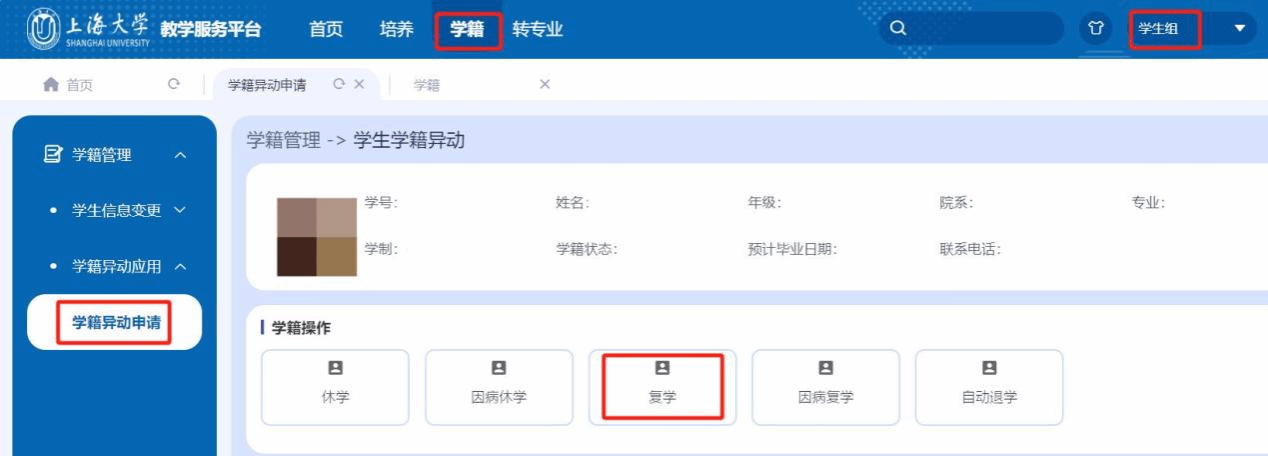(1)选择学籍异动的类型—复学,鼠标移动至“复学”处,点击申请;