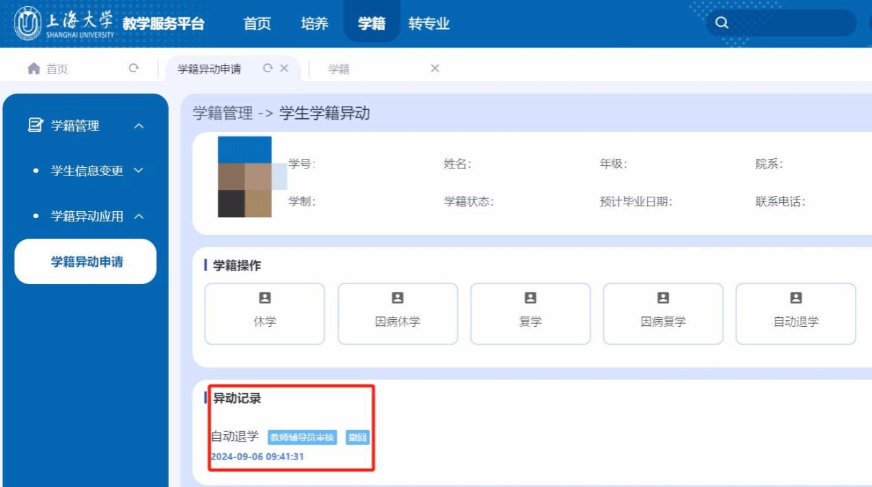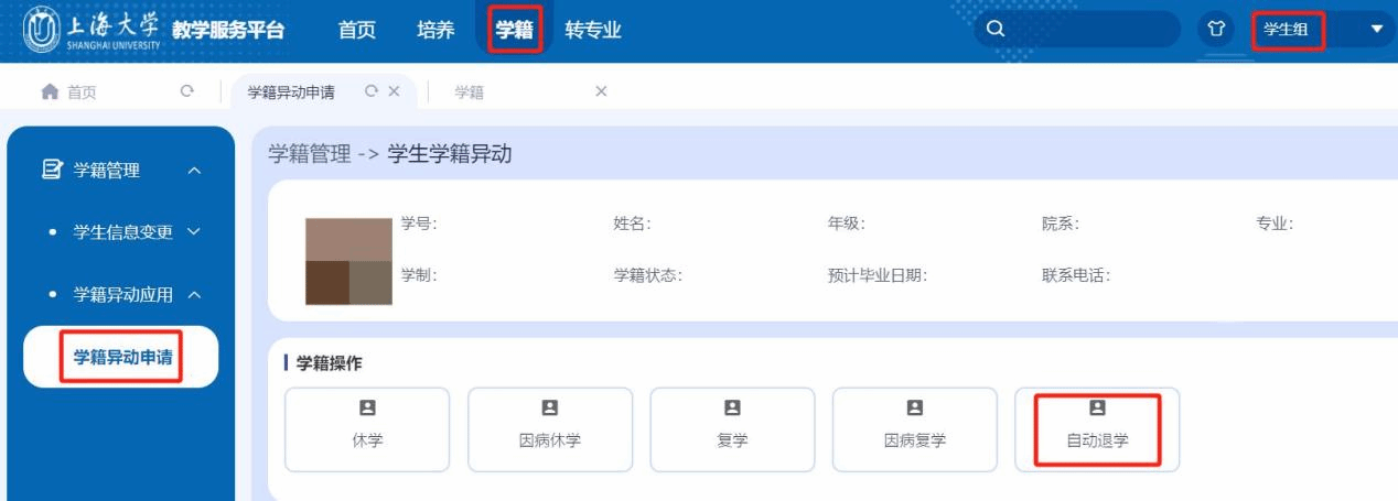1. 路径:【学籍】-【学籍管理】-【学籍异动应用】-【学籍异动申请】